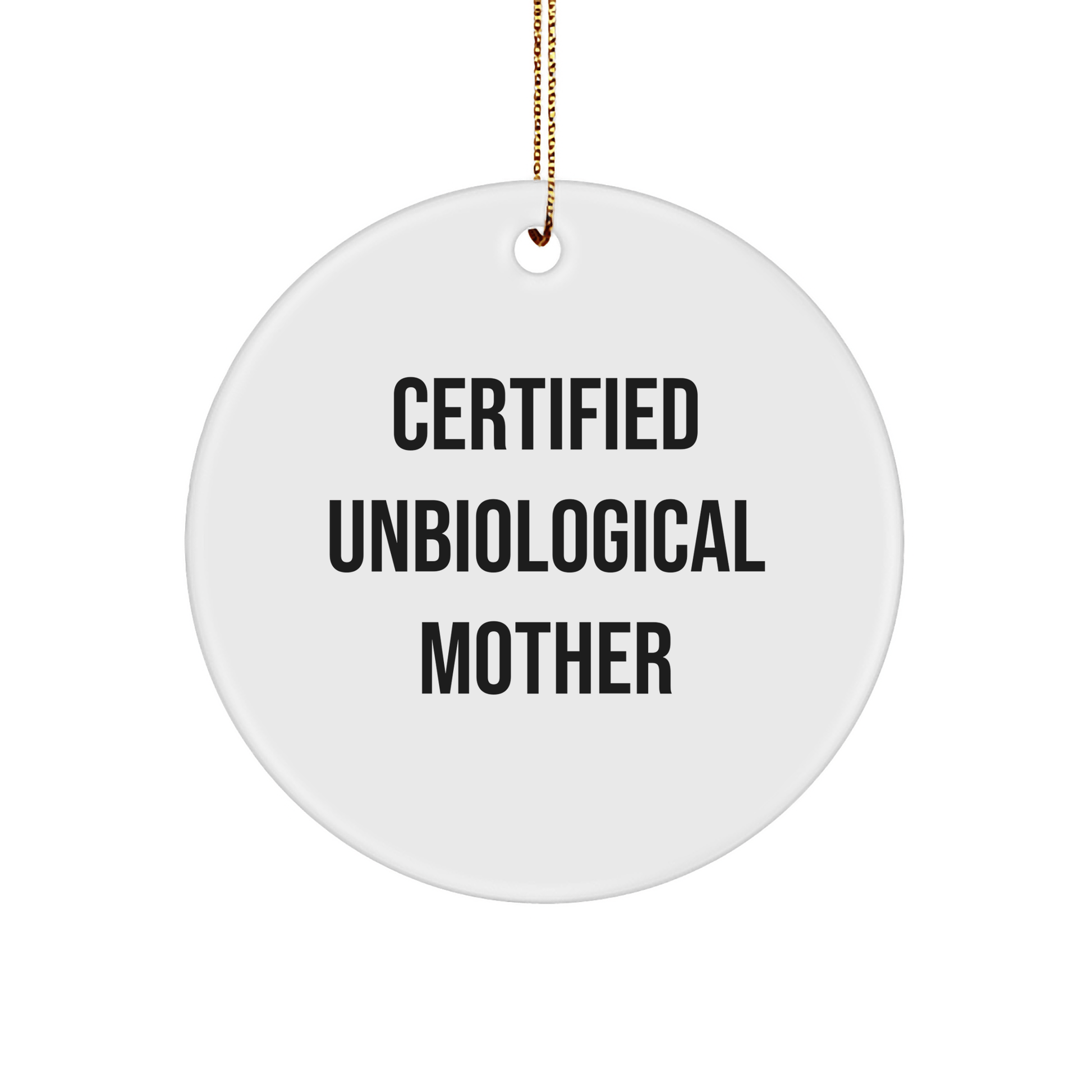 This ornament is crafted from sturdy MDF and features a high-gloss plastic finish, ensuring it will withstand the test of time. The quote 'Certified Unbiological Mother' is prominently displayed, making it a meaningful and personalized gift. Whether you're a biological or unbiological mother, this ornament is a celebration of the love and commitment that goes into raising a family.