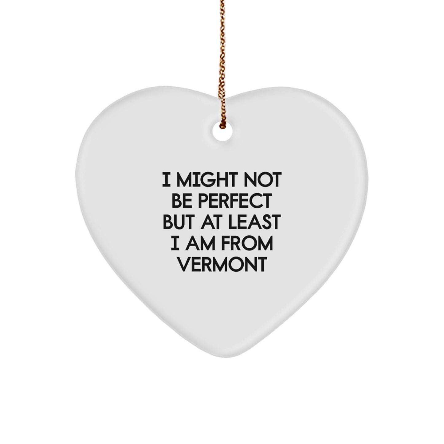 - Experience the charm of Vermont with our 'I Might Not Be Perfect But At Least I Am From Vermont' heart ornament, expertly crafted with a high-gloss plastic finish and vibrant colors that will add a touch of warmth to any room. Perfect for gifting or personal use, this ornament is a thoughtful way to celebrate your love for the Green Mountain State. (200-250 chars, includes 'Vermont', 'heart ornament', and 'Green Mountain State').