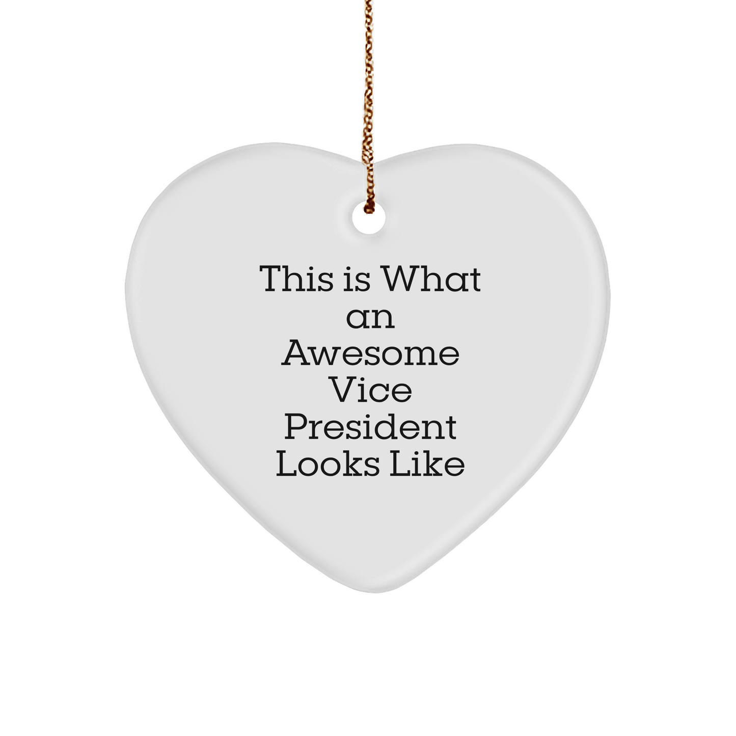 - Make a statement this Christmas with our 'This Is What An Awesome Vice President Looks Like' Heart Ornament, crafted from durable MDF with a high-gloss plastic finish, ensuring a long-lasting and vibrant design. Perfect for the modern office or home, this unique gift idea will be cherished by any Vice President or executive.