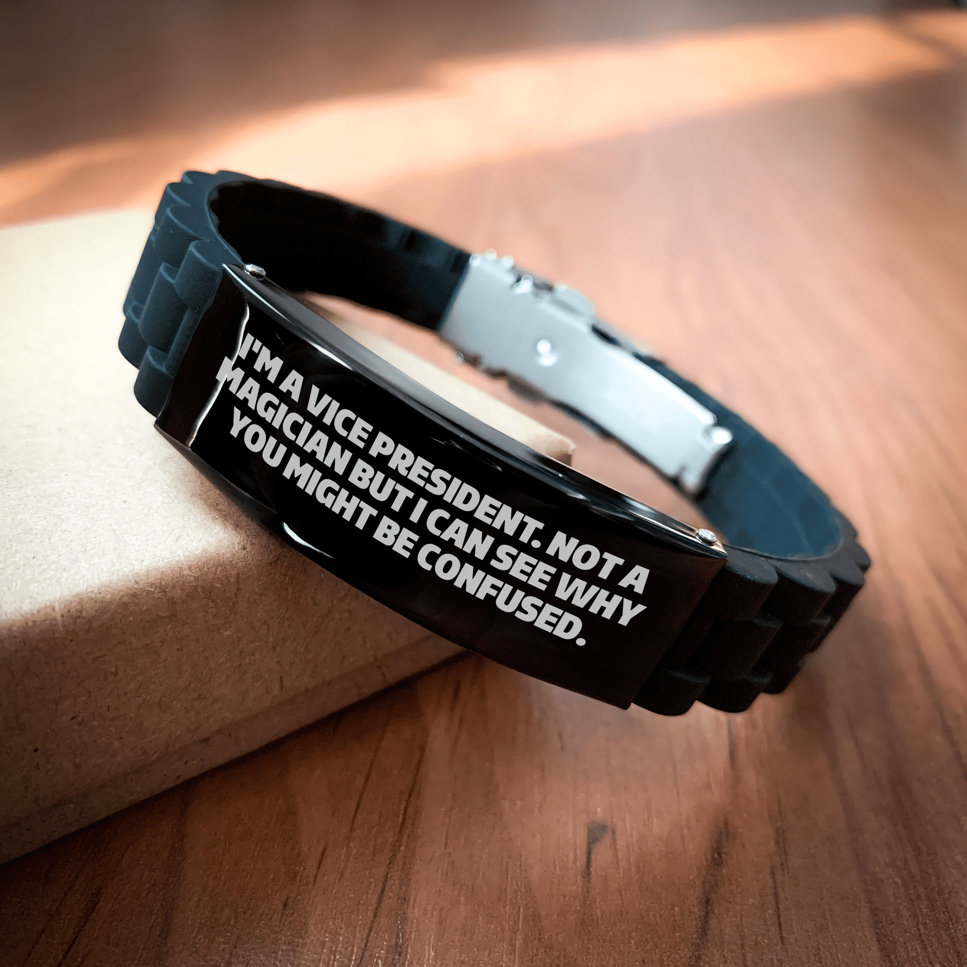 Are you looking for a unique gift for a Vice President? Look no further! This Glide lock Clasp Bracelet is a thoughtful and humorous gift that any Vice President would appreciate. Made from high-quality silver, black stainless steel, and silicone, this adjustable bracelet is sturdy and resistant to rust, corrosion, and tarnishing.