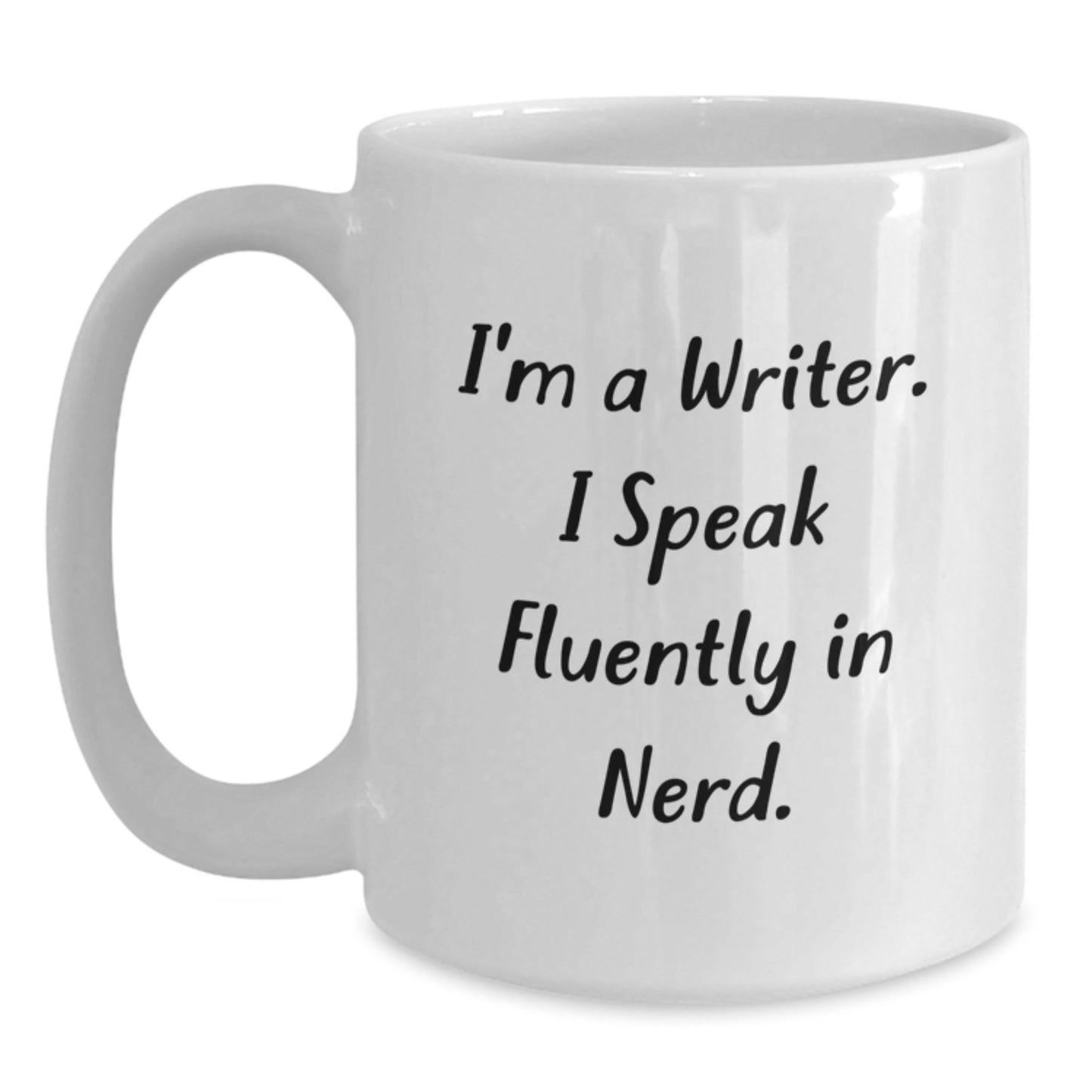- This funny white coffee mug is the ideal gift for writers, featuring the humorous quote 'I'm A Writer. I Speak Fluently In genius.' to bring a smile to their face.