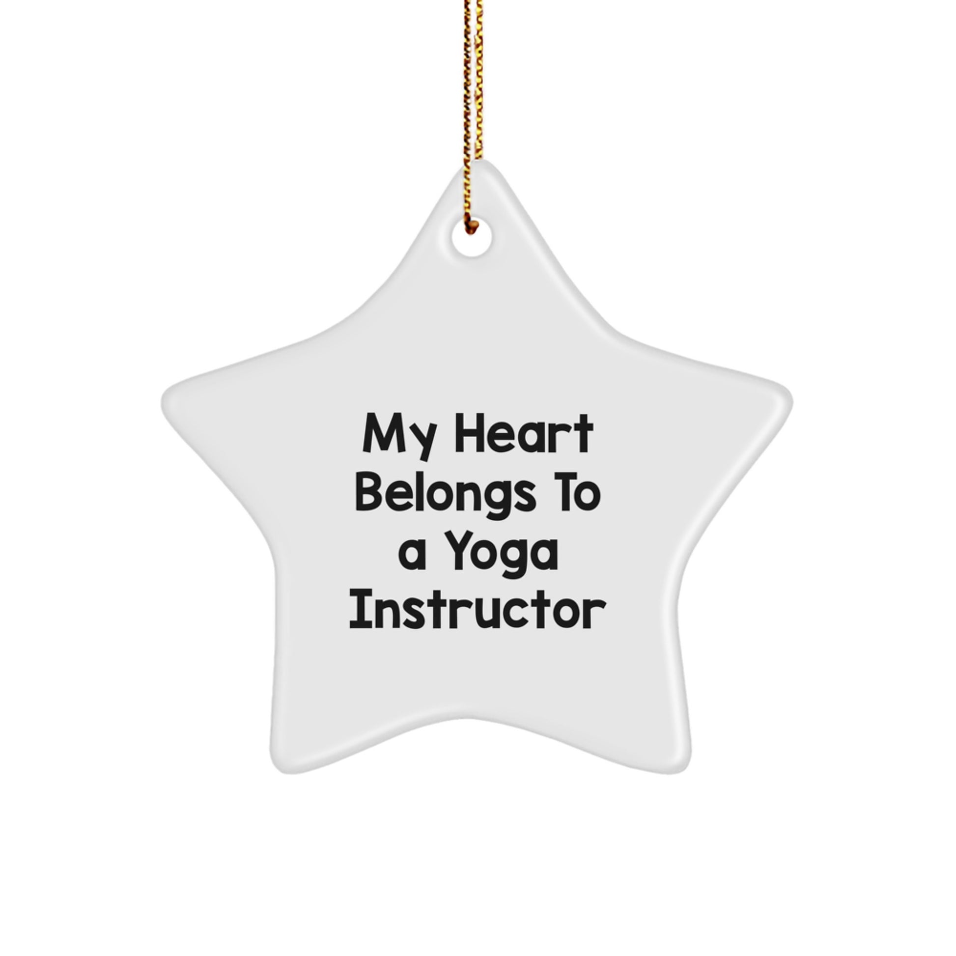 Are you looking for a unique and funny gift for the yoga instructor in your life? Look no further! This 'My Heart Belongs To A Yoga Instructor' star ornament is the perfect way to show your appreciation for their dedication to their craft. Made from sturdy MDF with a high-gloss plastic finish, this ornament is vibrantly printed from edge-to-edge via Sublimation, ensuring bright, vivid colors. Lightweight and resistant to breaking, it's a great choice for households with children or pets. Plus, it ships with a festive gold cord for easy hanging, making it perfect for stress-free decorating. Whether you're a friend, family member, or coworker, this ornament is sure to bring a smile to their face. So why wait? Give the gift of humor and appreciation with this one-of-a-kind star ornament.