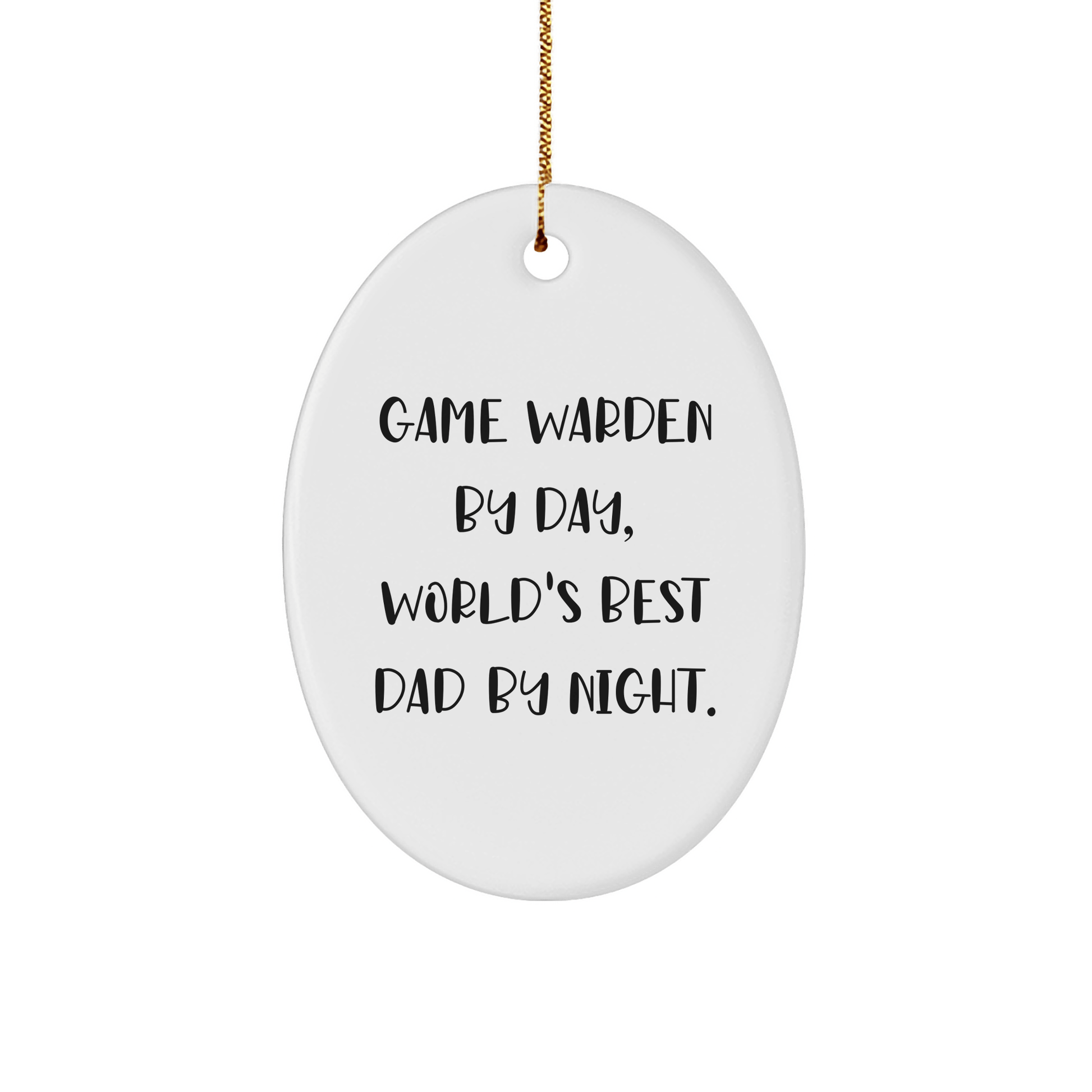 Are you a Game Warden enthusiast or looking for a unique gift for the Game Warden in your life? Look no further! This Oval Ornament is a thoughtful and humorous gift that showcases the Game Warden's dual personality - by day, a dedicated professional, and by night, the world's best dad. Made from sturdy MDF and featuring a high-gloss plastic finish, this ornament is vibrantly printed from edge-to-edge with a bright, vivid quote that's sure to bring a smile to his face. Perfect for hanging on the tree or displaying on a shelf, this ornament is lightweight and resistant to breaking, making it a great choice for households with children or pets.