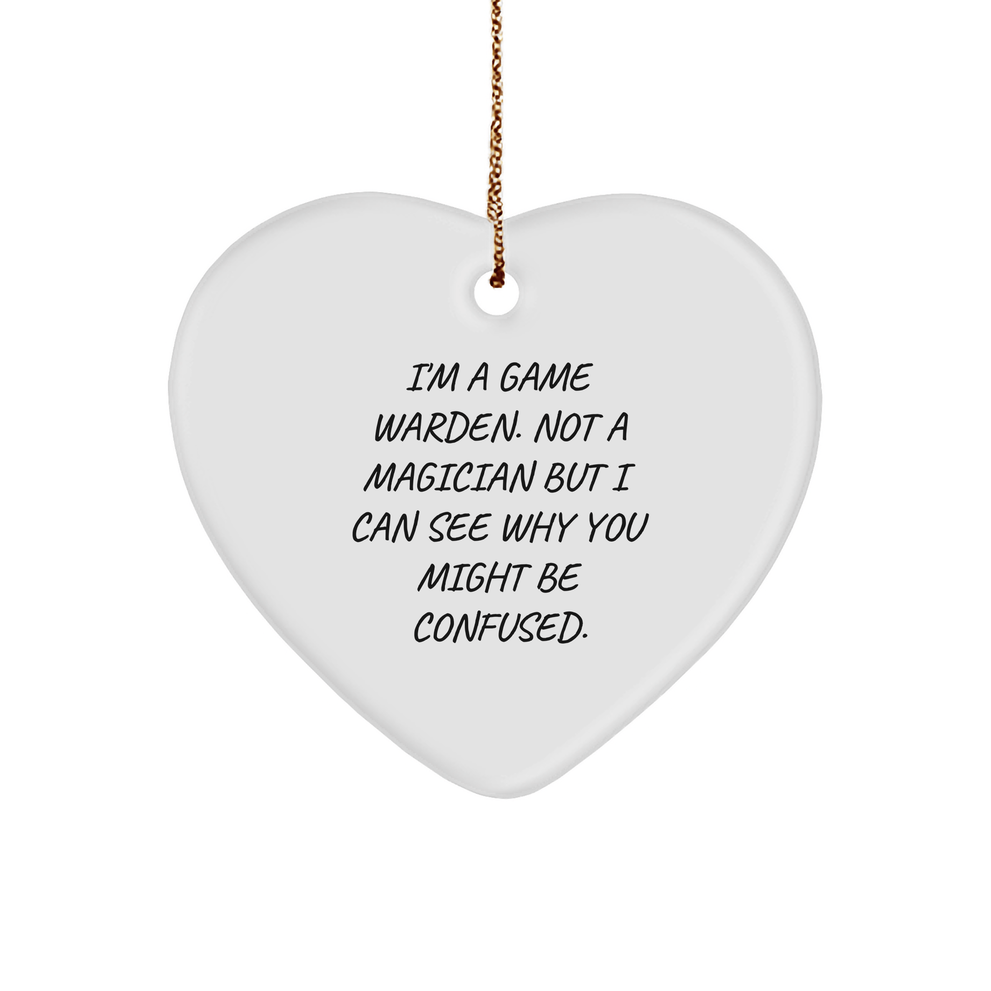 Are you a Game Warden or know someone who is? This unique heart ornament is a thoughtful gift for any occasion, especially Christmas. The quote 'I'm A Game Warden. Not A Magician But I Can See Why You Might Be Confused.' is a humorous take on the often-mysterious work of a Game Warden, and the heart shape represents the love and dedication they bring to their job.