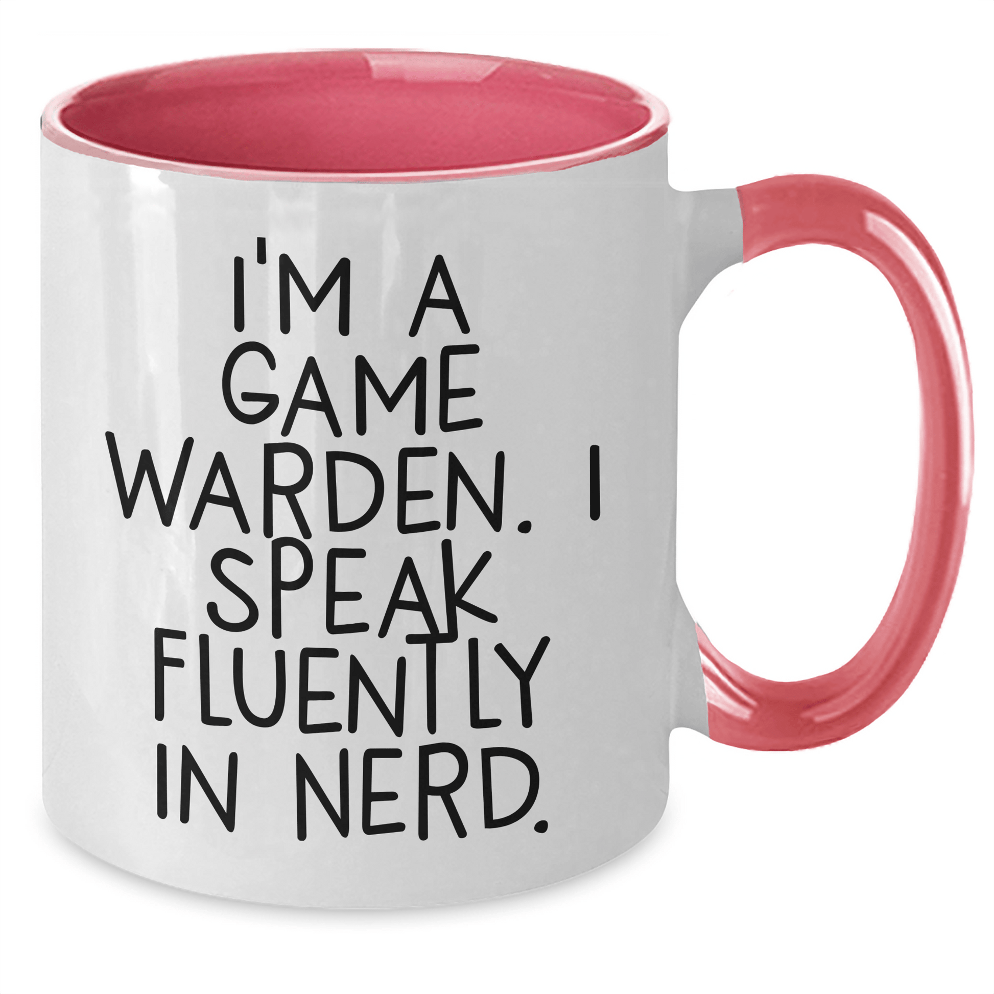 - Enhance your Game Warden style with our Two Tone Coffee Mug, perfect for sipping coffee or tea while on patrol. 'I'm A Game Warden. I Speak Fluently In Nerd.' is printed in bold font, making it a unique and humorous gift for any Game Warden. The ceramic material ensures durability and longevity.