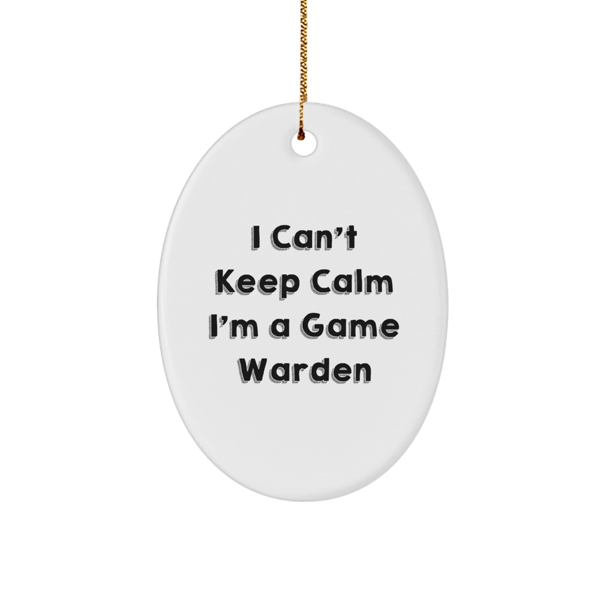 - This Game Warden Oval Ornament is a fun and unique way to show off your pride in being a Game Warden. The 'I Can't Keep Calm I'm A Game Warden' quote is printed in bright colors and is sure to bring a smile to any Game Warden's face.