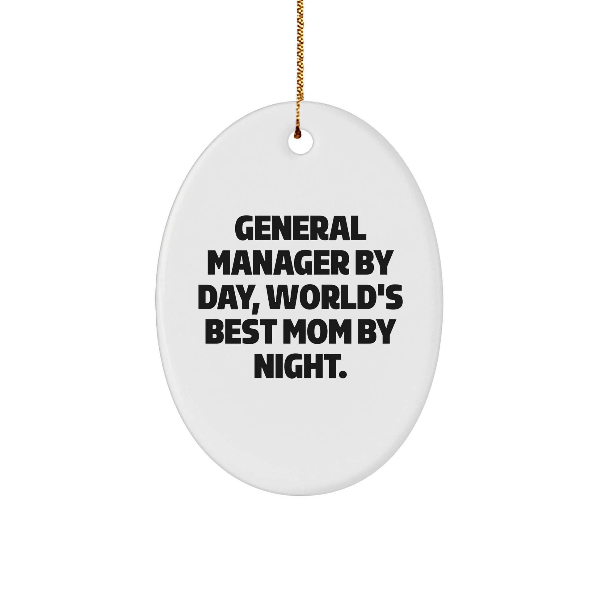 Are you looking for a thoughtful gift for the General Manager in your life? Look no further! This Oval Ornament is a unique and personalized way to show your appreciation. The quote 'General Manager By Day, World's Best Mom By Night' is a funny and heartwarming way to capture the essence of a General Manager's role. Made from sturdy MDF with a high-gloss plastic finish, this ornament is lightweight and resistant to breaking, making it perfect for households with children or pets. The festive gold cord makes it easy to hang and decorate for Christmas. Whether you're a friend, family member, or coworker, this ornament is a thoughtful gift for any General Manager. This Christmas, show your General Manager that you care with this special and personalized gift.