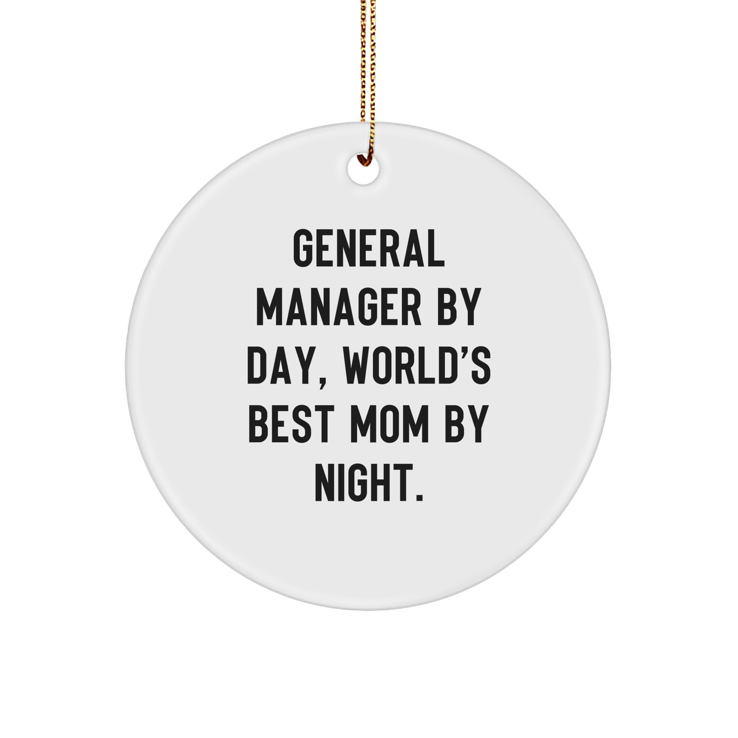 Are you a fan of the General Manager or looking for a unique gift for someone who is? This Circle Ornament is the perfect way to show your appreciation and add a touch of humor to their office or home decor. The quote 'General Manager By Day, World's Best Mom By Night.' is a funny and relatable reminder that even the most dedicated professionals have a softer side.