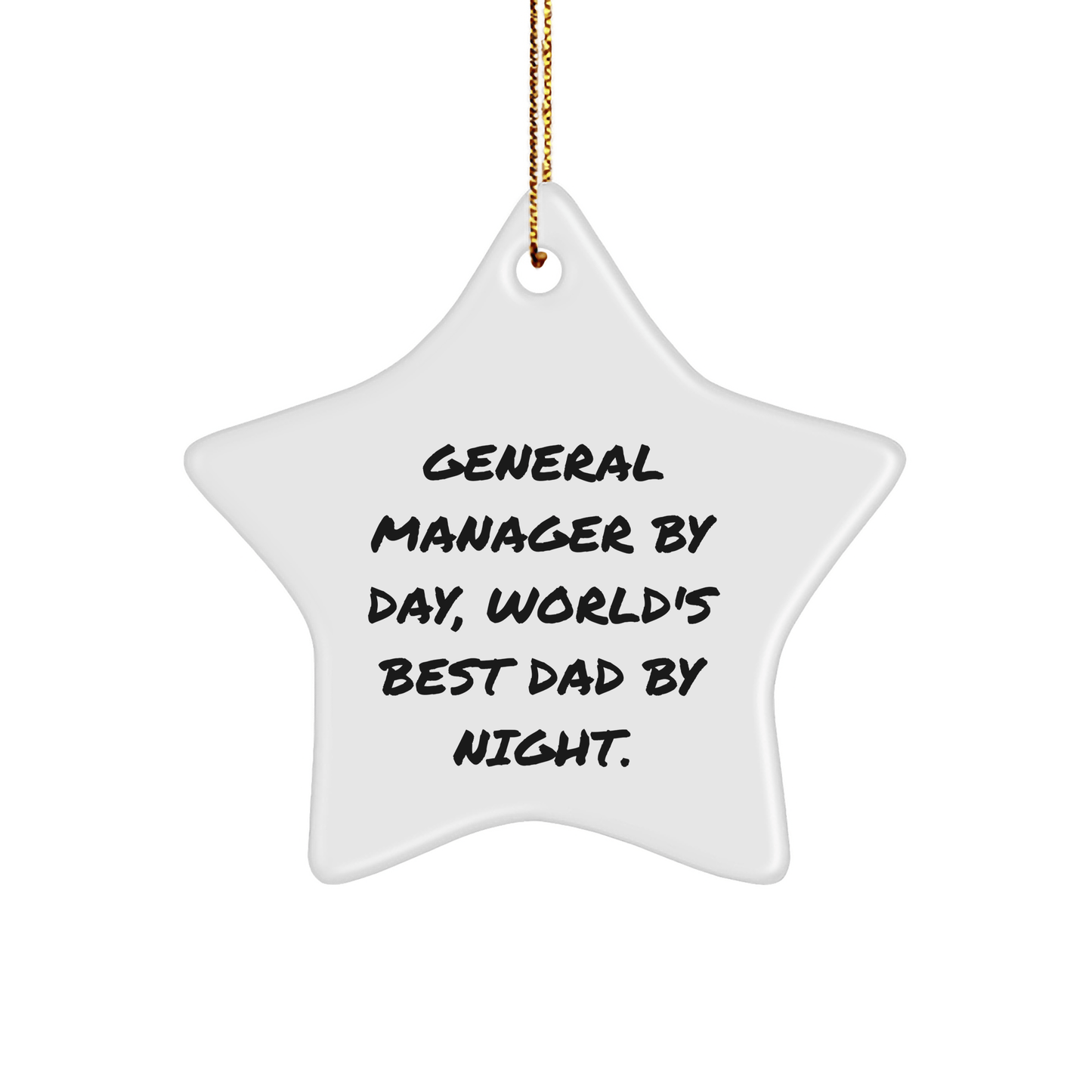 - Make a shining impression with this 'General Manager By Day, World's Best Dad By Night.' star ornament, perfect for the modern General Manager who's also a devoted dad, and show off your unique personality with this vibrant addition to your Christmas decor.