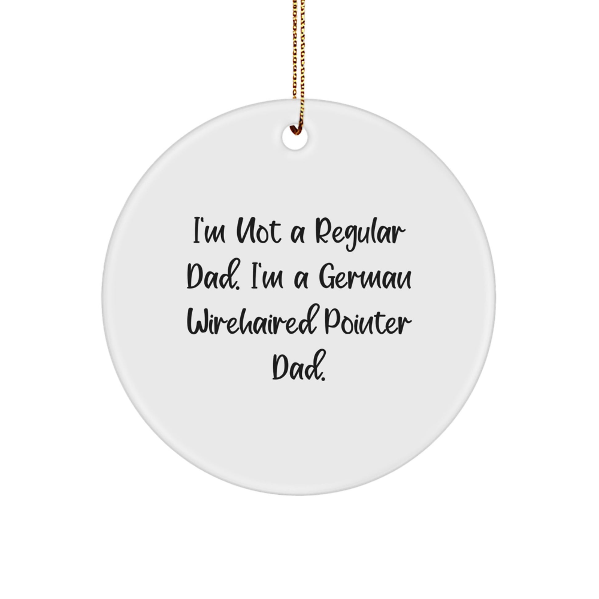 If you're a German Wirehaired Pointer Dog enthusiast or searching for a unique gift for the dog dad in your life, this circle ornament is the perfect choice. With its vibrant quote 'I'm Not A Regular Dad. I'm A German Wirehaired Pointer Dad.' printed on sturdy MDF material, this ornament is sure to bring a smile to their face. The high-gloss finish ensures long-lasting designs, and the lightweight construction makes it resistant to breaking. Whether you're a dog parent or just a fan of the breed, this ornament is a thoughtful gift for the special German Wirehaired Pointer Dog in your life. Give a thoughtful gift from dad to family this Christmas season and make it a holiday to remember.