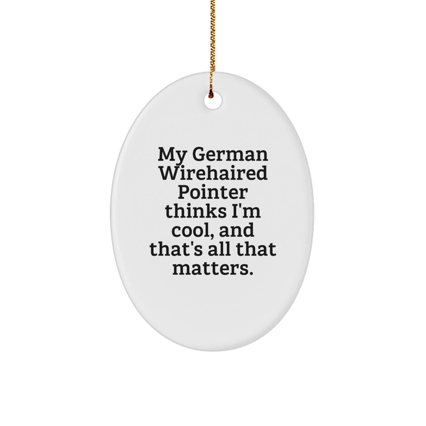 - Say it loud and proud with our German Wirehaired Pointer Dog Oval Ornament, featuring the quote 'My German Wirehaired Pointer thinks I'm cool, and that's all that matters.' - a fun and unique decoration for any dog enthusiast.
