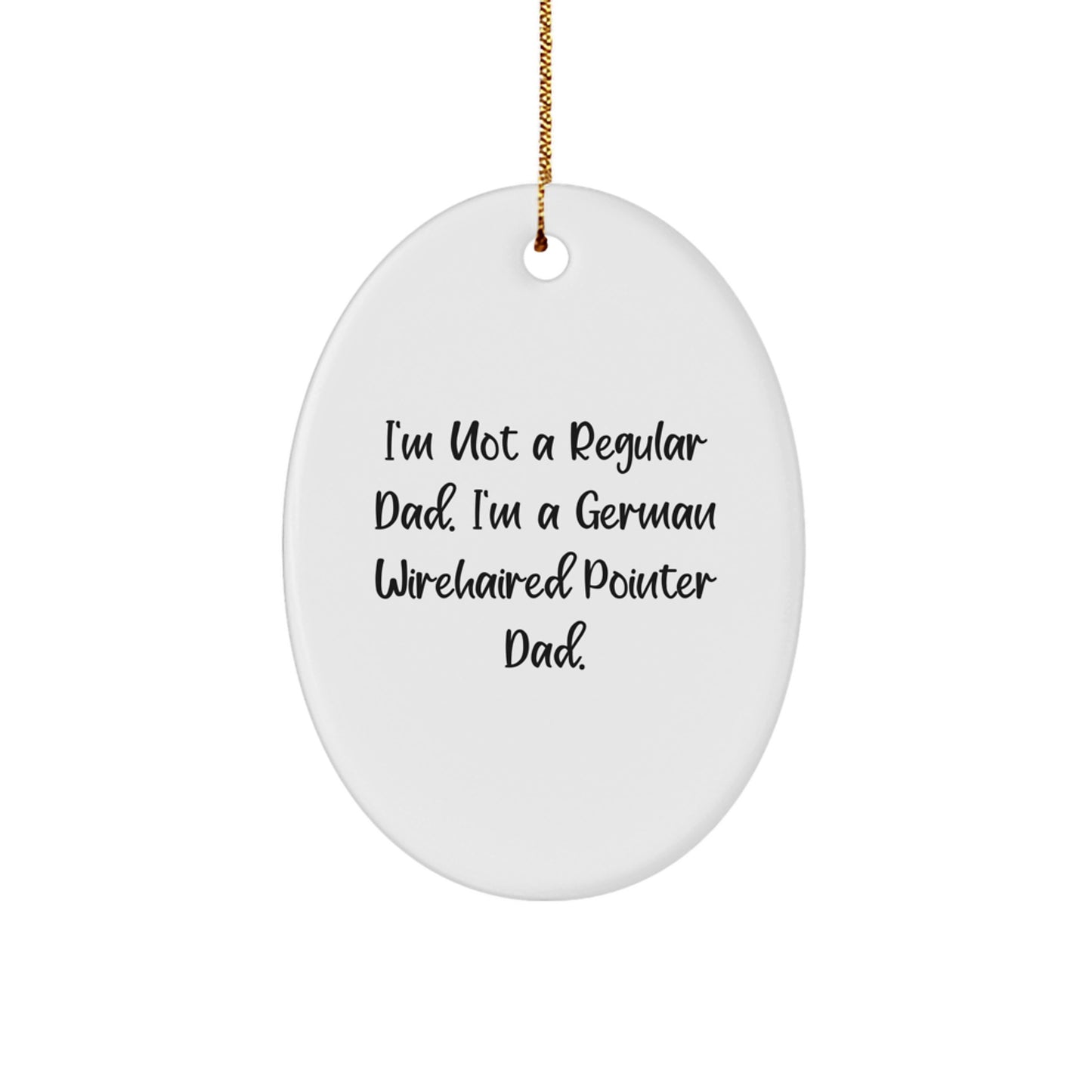 Are you a German Wirehaired Pointer Dog enthusiast or looking for a unique gift for the dad in your life? This adorable Oval Ornament is the perfect way to show off your love for these lovable dogs. With its white color and oval shape, it's a stylish addition to any room. The quote 'I'm Not A Regular Dad. I'm A German Wirehaired Pointer Dad.' adds a touch of humor and personality to the design. Whether you're giving it as a gift or keeping it for yourself, this Ornament is sure to bring a smile to your face. Make it a special Christmas gift for your husband, dad, or friend who loves German Wirehaired Pointer Dogs.