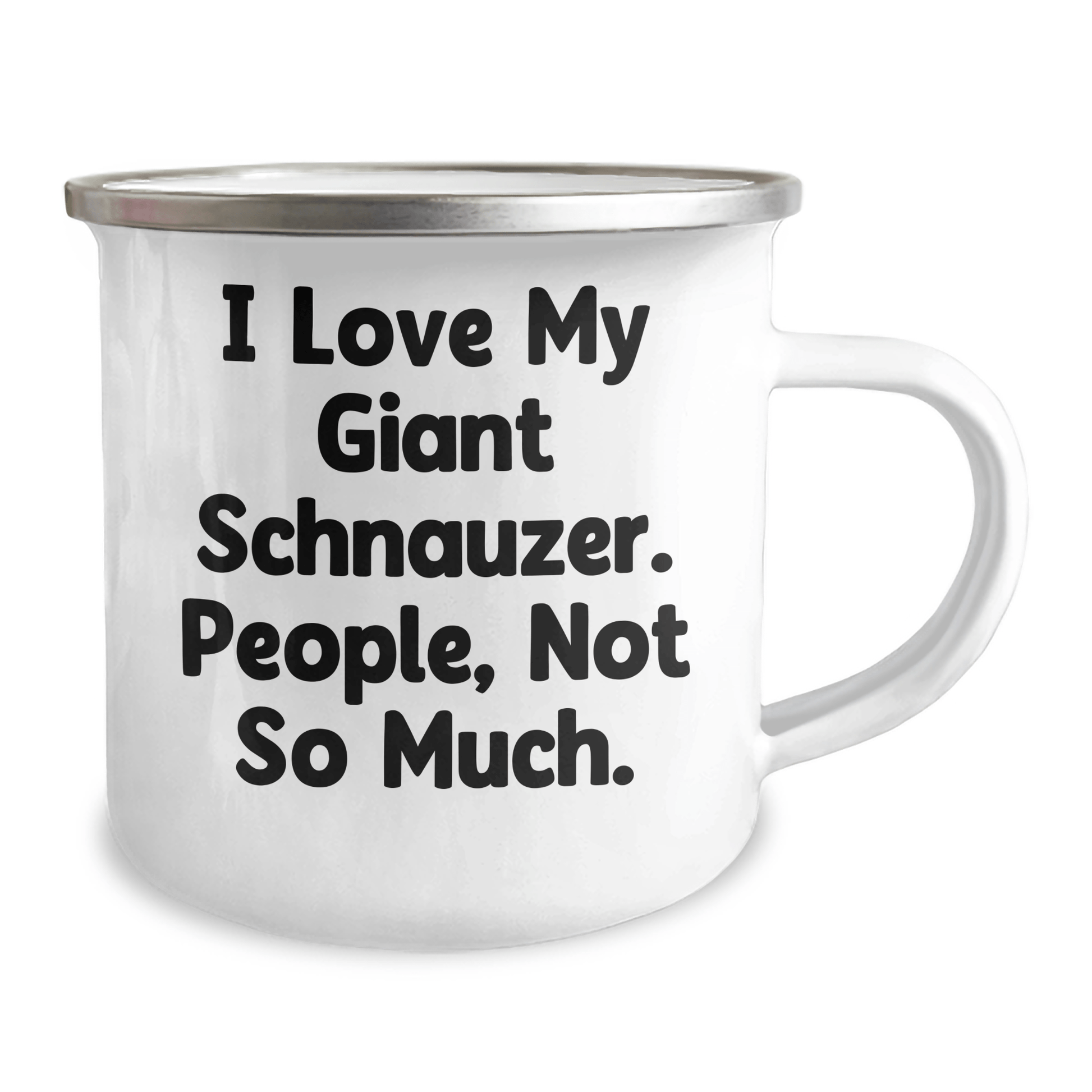 If you're a giant Schnauzer dog enthusiast or know someone who is, this camping mug is the ideal gift for them! The funny quote 'I Love My Giant Schnauzer. People, Not So Much.' is sure to bring a smile to their face. This 12 oz stainless steel mug with enamel finish is sturdy and easy to clean, making it perfect for camping trips, hiking adventures, or just relaxing at home. Whether you're a mom, dad, or friend, this gift is sure to be a hit. So why wait? Get your unique gift today and make some unforgettable memories with your loved ones!