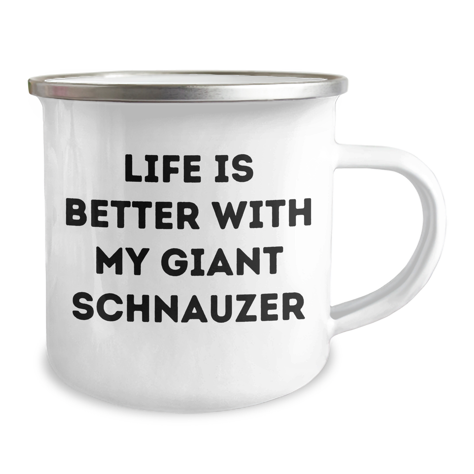 Are you a Giant Schnauzer Dog enthusiast or looking for a unique gift for the dog lover in your life? This funny camping mug is perfect for anyone who says 'Life Is Better With My Giant Schnauzer'! Made of sturdy stainless steel with enamel finish, this 12 oz mug is designed for daily use. The permanent printing ensures the design won't fade even after multiple washes.
