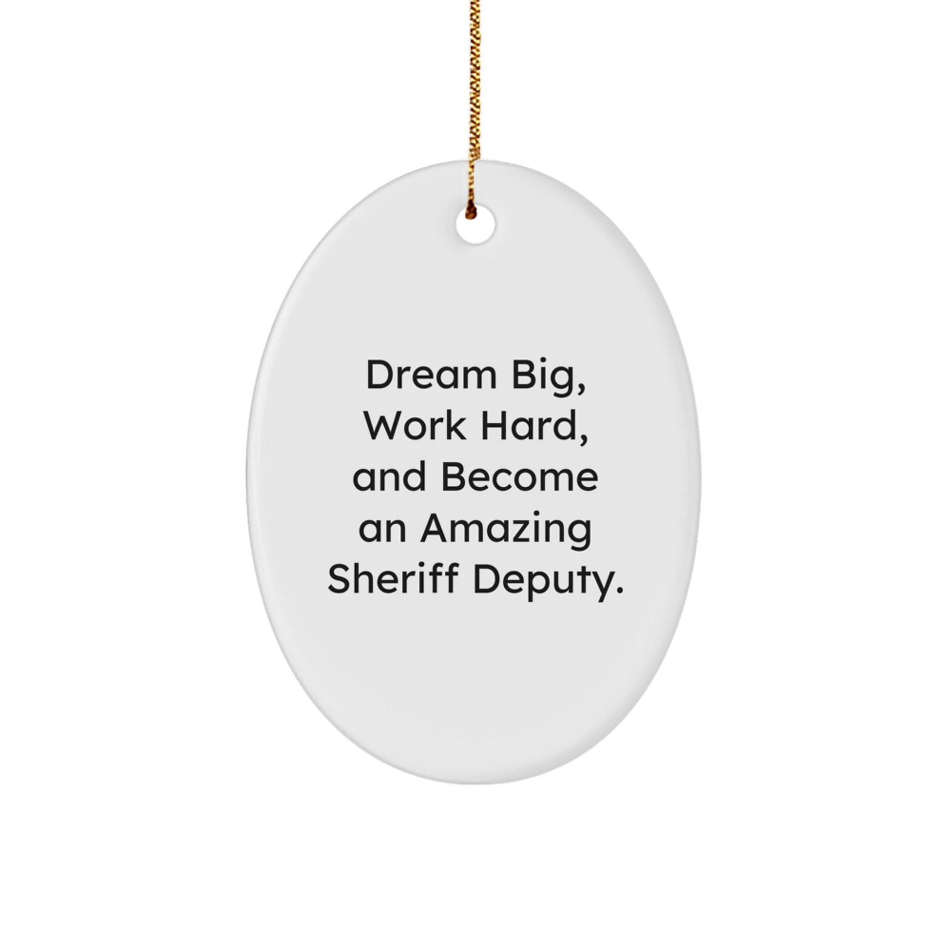 - This oval ornament features the inspiring quote 'Dream Big, Work Hard, And Become An Amazing Sheriff Deputy.' in a vibrant, high-gloss finish, perfect for decorating your Christmas tree or mantel.