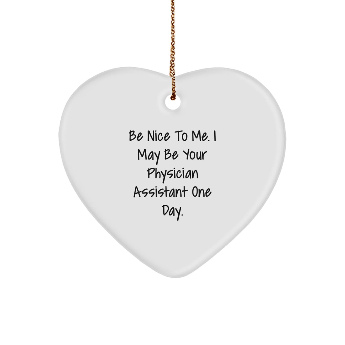 Are you a Physician Assistant enthusiast or looking for a unique gift for someone who is? Look no further! This Heart Ornament is the perfect way to show your appreciation and support. Featuring a funny quote that's sure to bring a smile, 'Be Nice To Me. I May Be Your Physician Assistant One Day.', this ornament is a great way to decorate your home or give as a gift. Made from sturdy MDF with a high-gloss plastic finish, it's lightweight and resistant to breaking, making it perfect for households with children or pets. Ships with a festive gold cord for easy hanging. Whether you're giving it as a gift or keeping it for yourself, this ornament is sure to be a hit. Make it a special Christmas gift for your loved one and show them how much you care.