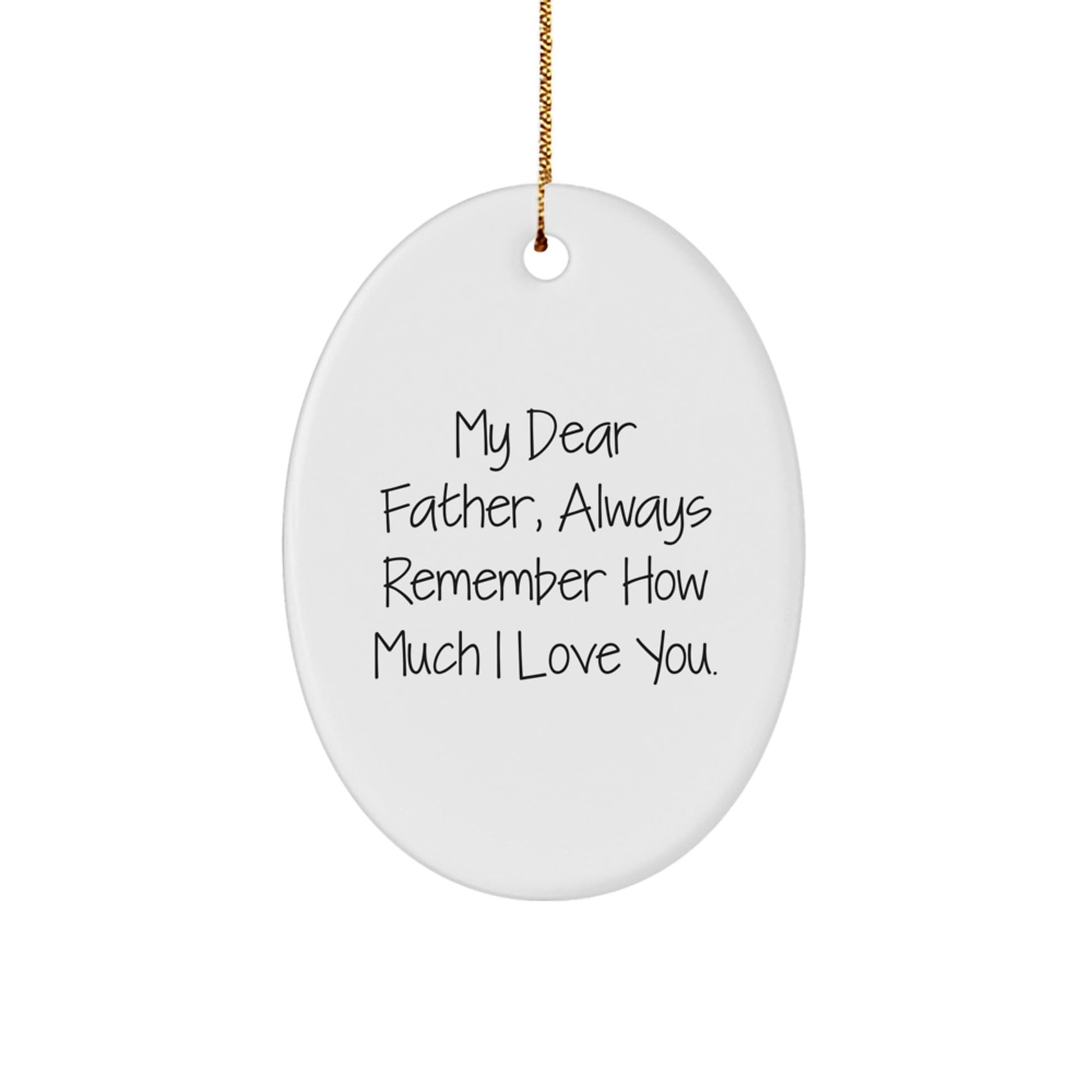 We're excited to introduce this heartwarming Father's Day gift, perfect for the special father in your life. This beautifully crafted oval ornament features a quote that will surely touch his heart: 'My Dear Father, Always Remember How Much I Love You.' Made from sturdy MDF with a high-gloss plastic finish, this ornament is lightweight and resistant to breaking, making it a great choice for households with children or pets. The vibrant colors and festive gold cord add a touch of elegance and make it easy to hang. Whether you're looking for a thoughtful gift for your father, grandfather, or the father of your children, this ornament is sure to bring a smile to his face. Give the gift of love and appreciation this Christmas and make this special day truly unforgettable.