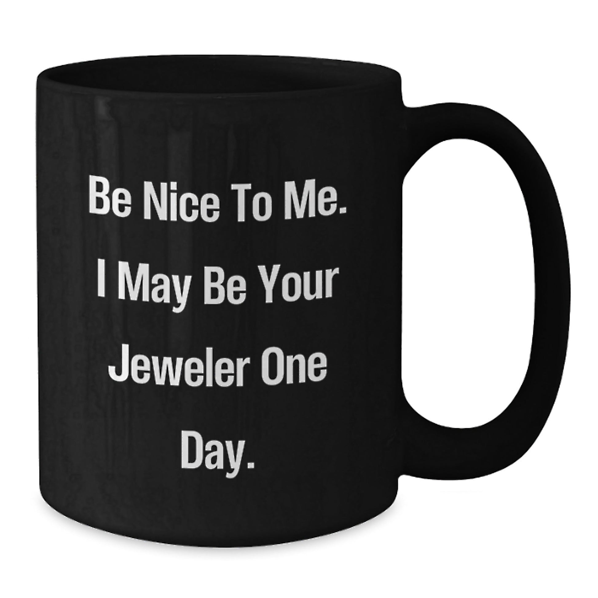 Are you looking for a unique gift for the jeweler in your life? Look no further! This Black Coffee Mug is the perfect way to show your appreciation for their hard work and dedication. The quote 'Be Nice To Me. I May Be Your Jeweler One Day.' adds a touch of humor and inspiration to this already thoughtful gift. The mug is available in black and has a capacity of 11oz or 15oz, making it perfect for hot or cold beverages. Plus, it's microwave and dishwasher safe, making it easy to clean and maintain. Whether you're a friend, family member, or coworker, this gift is sure to bring a smile to the jeweler's face. So why wait? Don't miss out and show your jeweler how much you appreciate them!