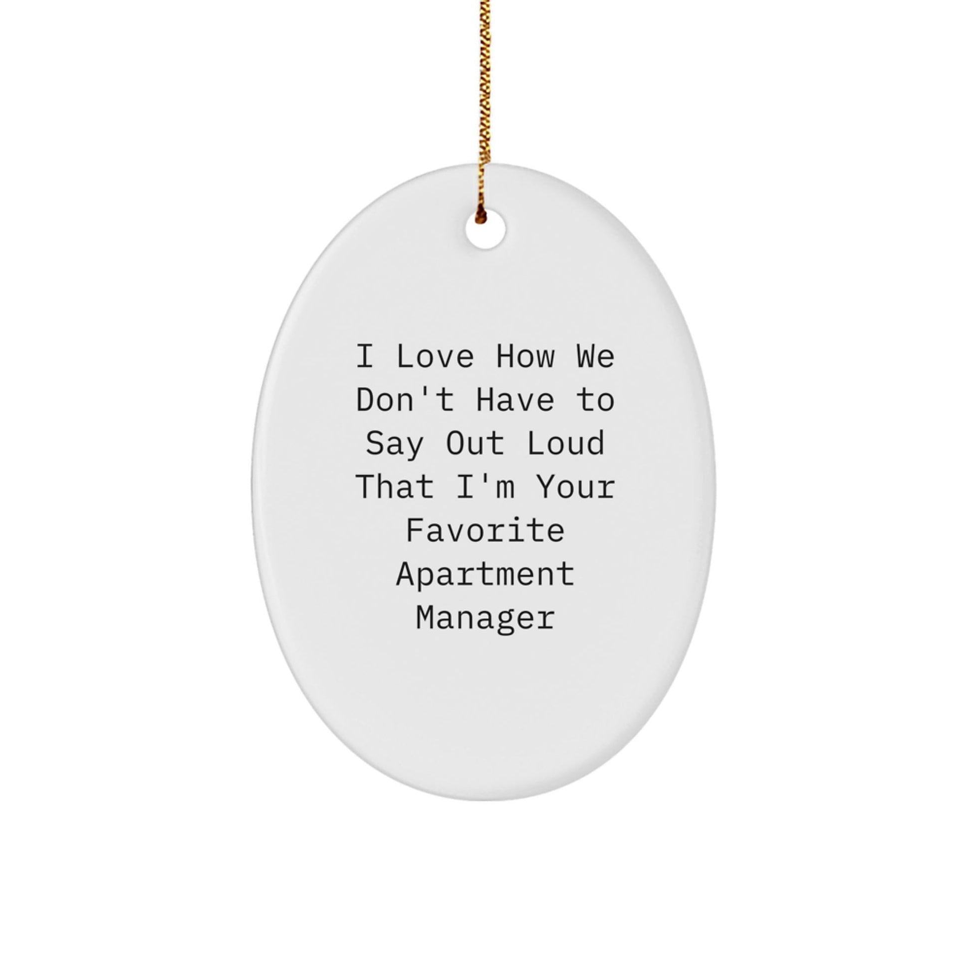 - Experience the perfect blend of style and functionality with our 'I Love How We Don't Have To Say Out Loud That I'm Your Favorite Apartment Manager' Oval Ornament, carefully crafted to make your holiday decorating a breeze. As an Apartment Manager, you deserve a thoughtful gift that shows your appreciation for your residents, and this vibrant ornament is the perfect choice.
