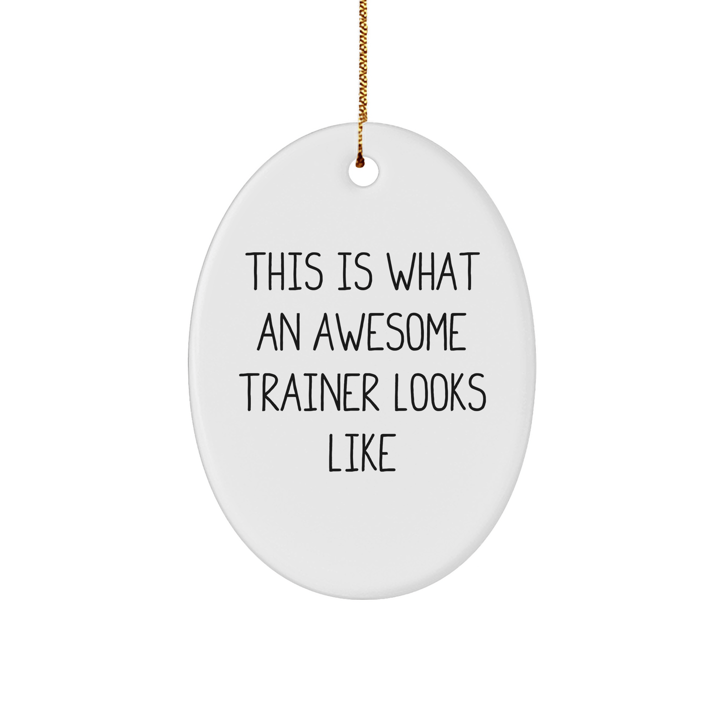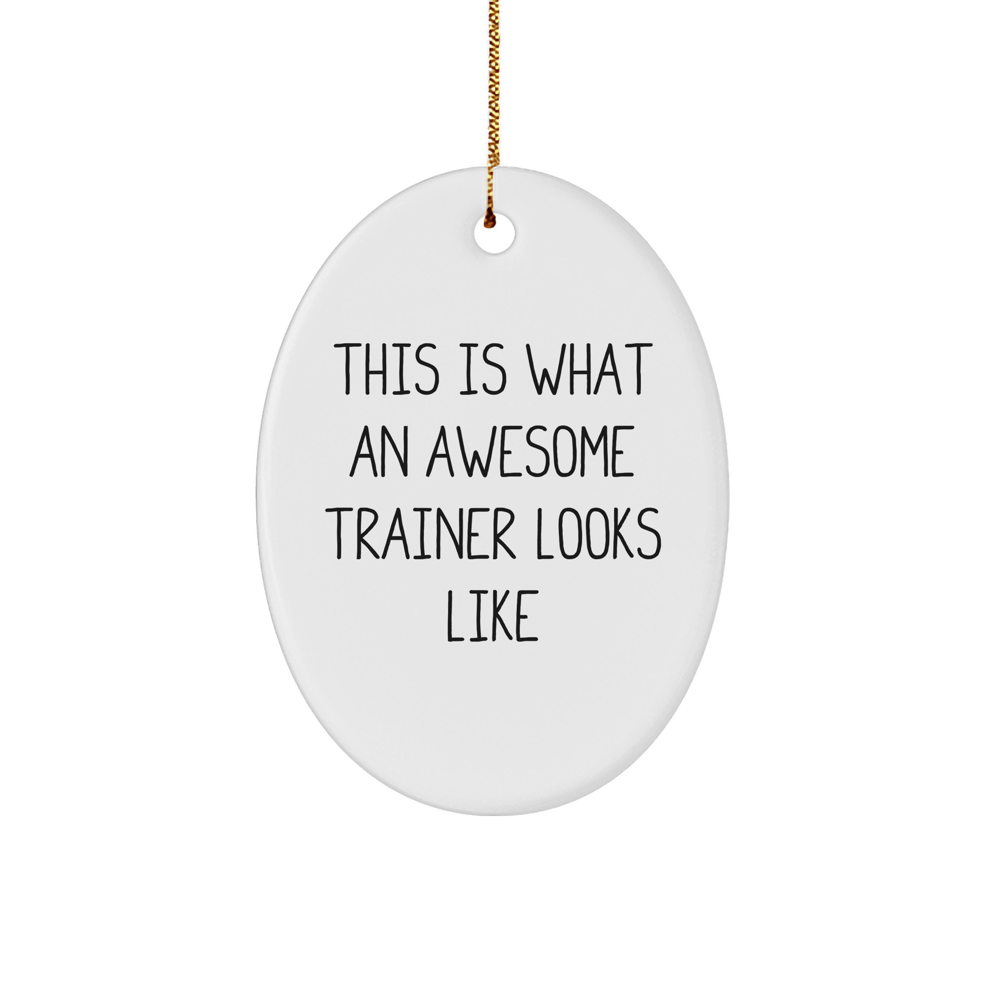 Looking for a unique gift for the trainers in your life? This Is What An Awesome Trainer Looks Like Oval Ornament is a fun and inspirational way to show your appreciation. Made from sturdy MDF with a high-gloss plastic finish, this ornament is lightweight and resistant to breaking, making it perfect for households with children or pets. The vibrant print is edge-to-edge via Sublimation, ensuring bright and vivid colors. And with a festive gold cord for easy hanging, decorating has never been easier. Whether you're giving it as a gift or keeping it for yourself, this ornament is sure to bring a smile to the face of any trainer. Get ready to make a statement with this fun and motivational Oval Ornament, perfect for any trainer or fitness enthusiast.