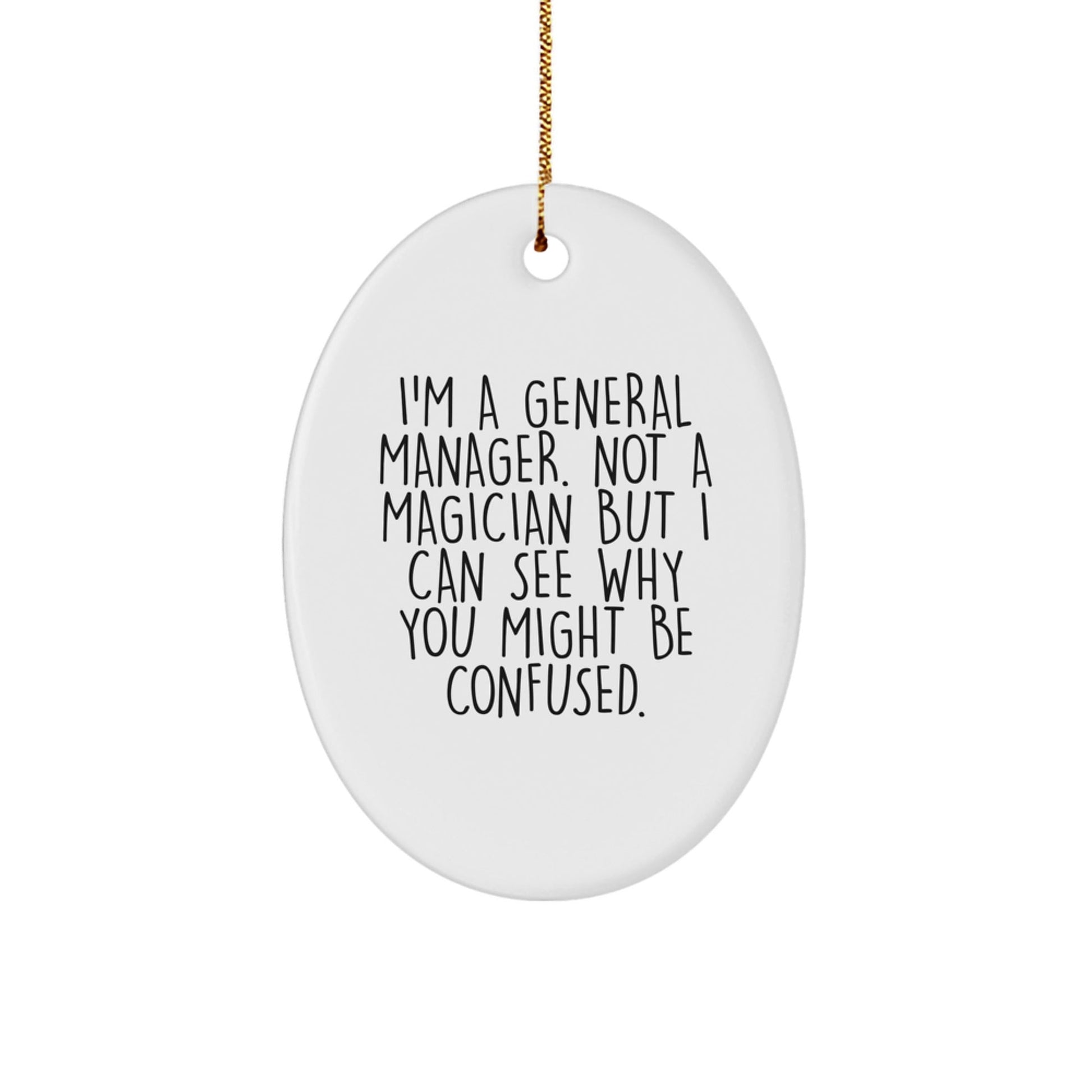 Are you a General Manager looking for a unique Christmas gift for your colleagues or a special keepsake for yourself? Look no further! This Oval Ornament is a thoughtful gift that celebrates your profession with a humorous twist. The quote 'I'm A General Manager. Not A Magician But I Can See Why You Might Be Confused.' is a relatable and entertaining way to acknowledge the challenges and responsibilities that come with being a General Manager.