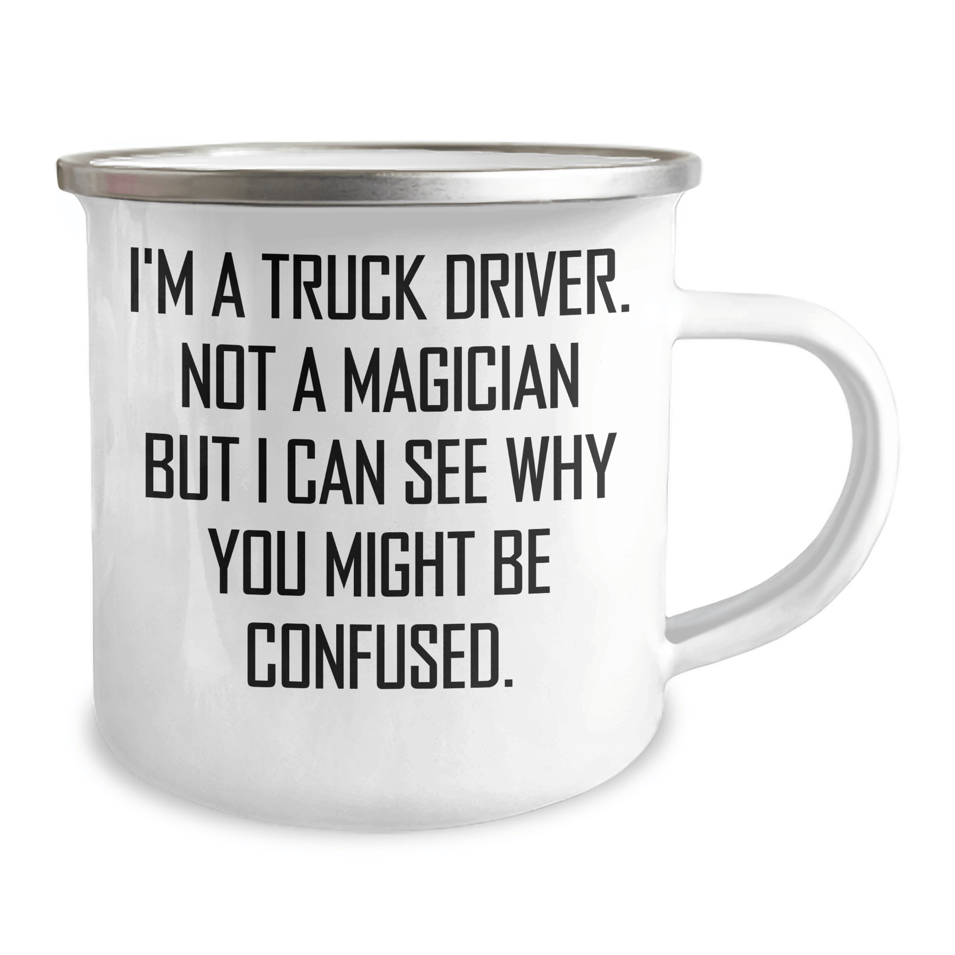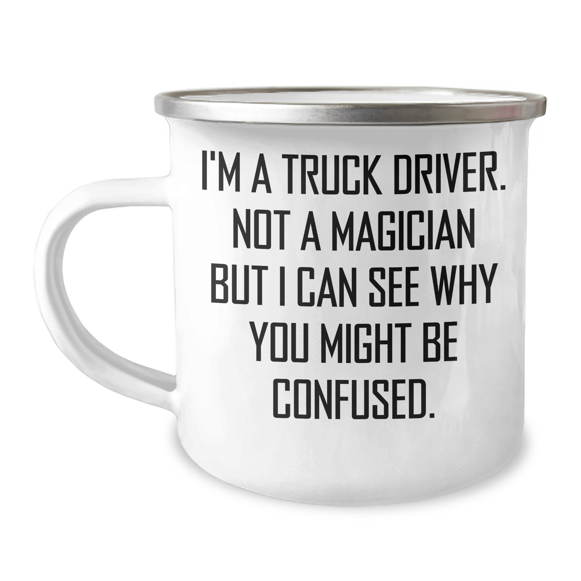 - Get ready to make a statement with our 'I'm A Truck Driver. Not A Magician But I Can See Why You Might Be Confused.' Camping Mug. Its bold design and sturdy construction make it perfect for daily use, whether you're at home or on the road. Plus, its stainless steel with enamel finish ensures it's easy to clean and maintain.