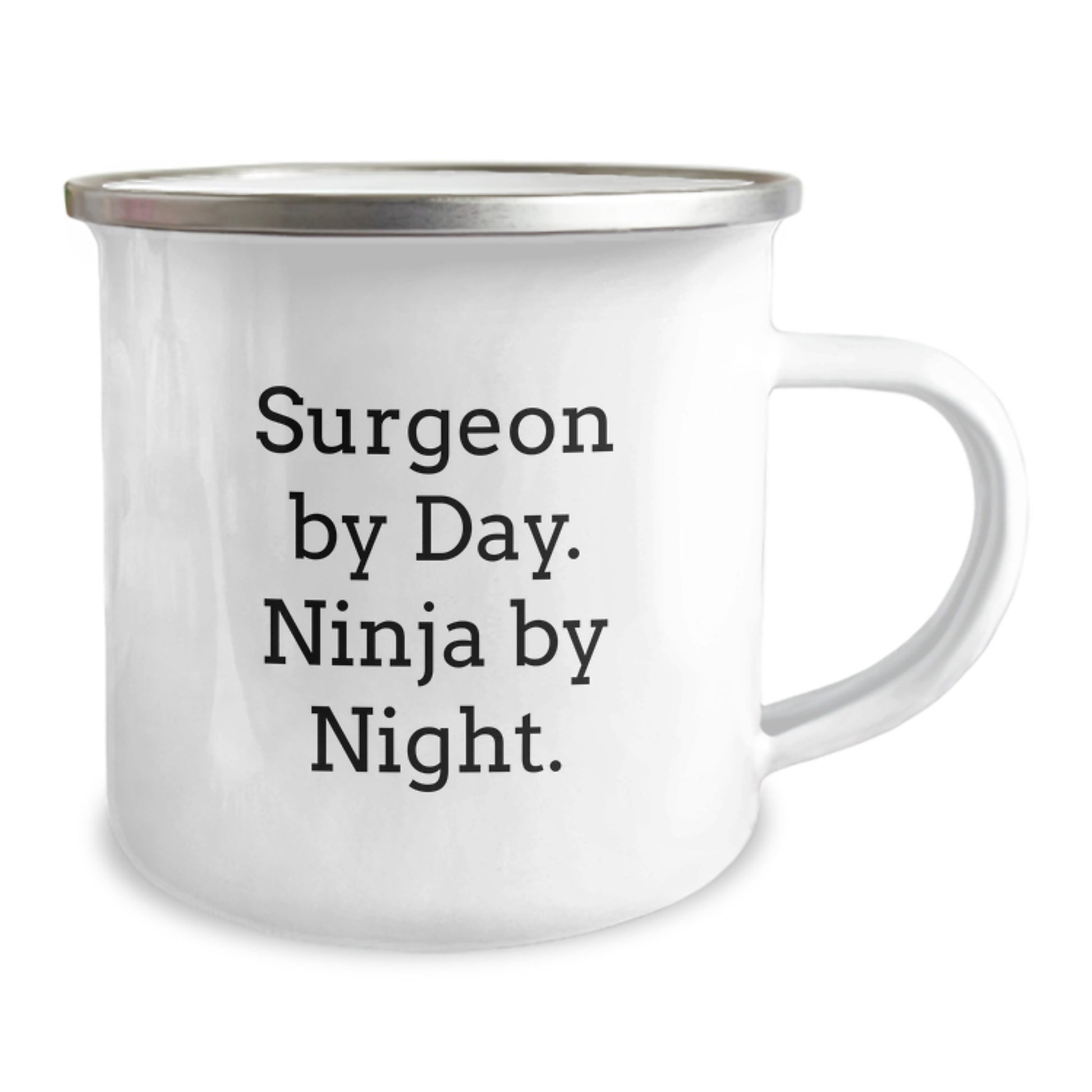 - This camping mug is the ideal gift for any surgeon in your life. Made of high-quality stainless steel with an enamel finish, it's sturdy and long-lasting. The 'Surgeon By Day. Ninja By Night.' quote will remind them that even in their busiest moments, they are still a ninja at heart.