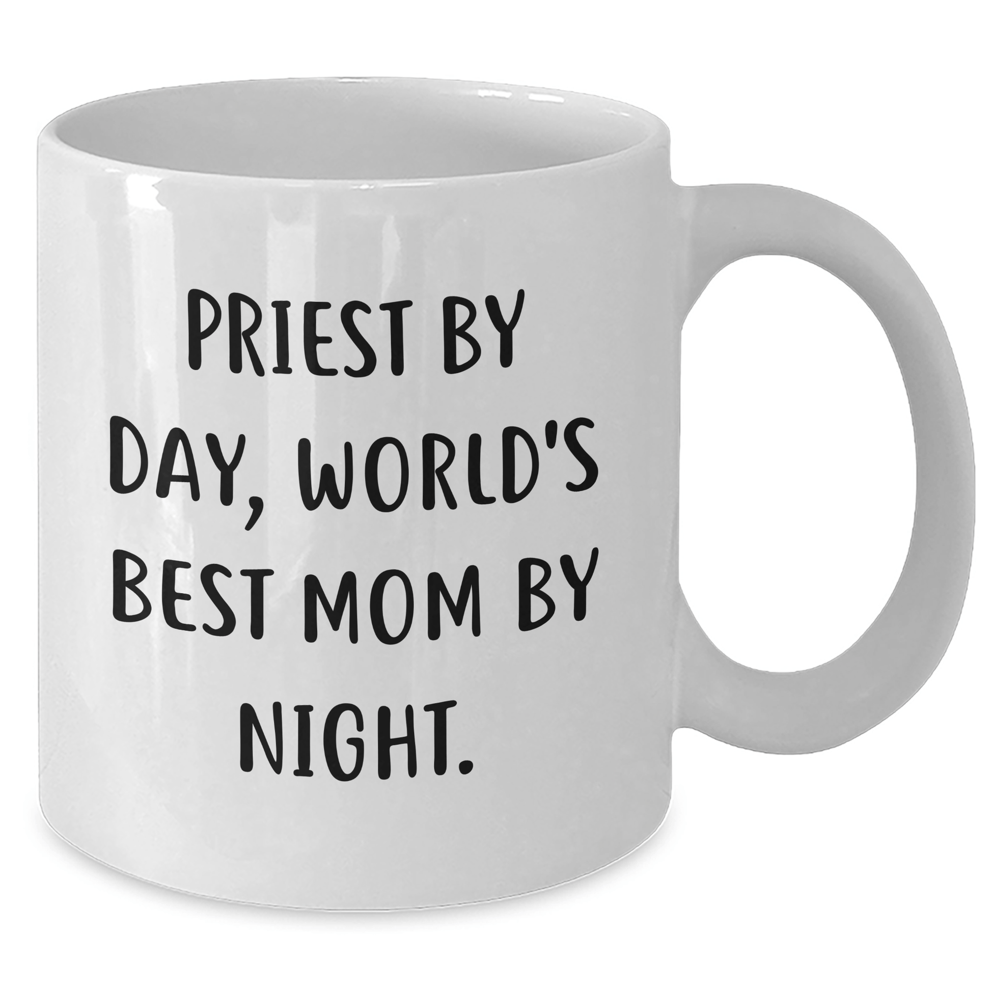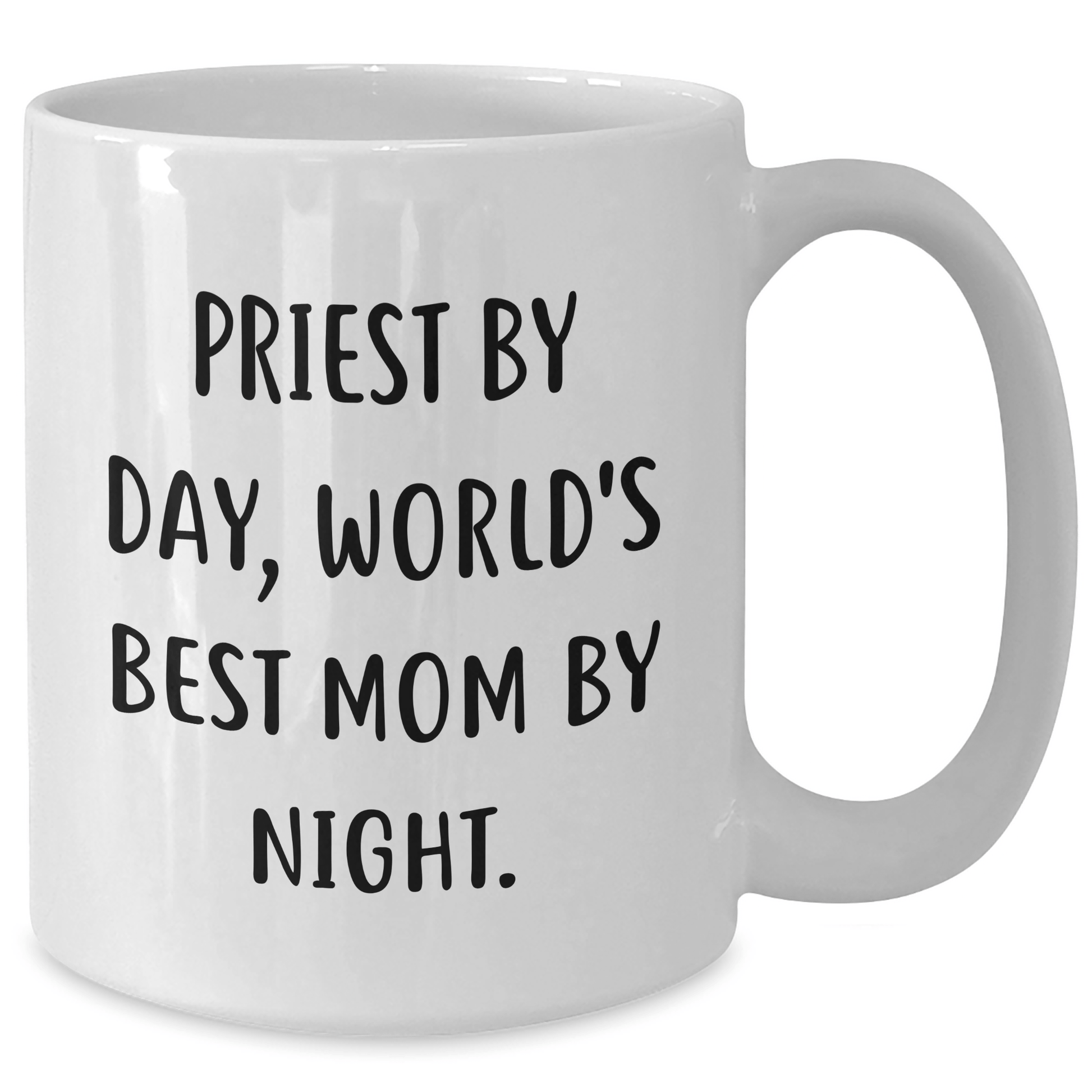 - This funny white coffee mug is the perfect way to show your appreciation for the Priest in your life, with its smart quote 'Priest By Day, World's Best Mom By Night',