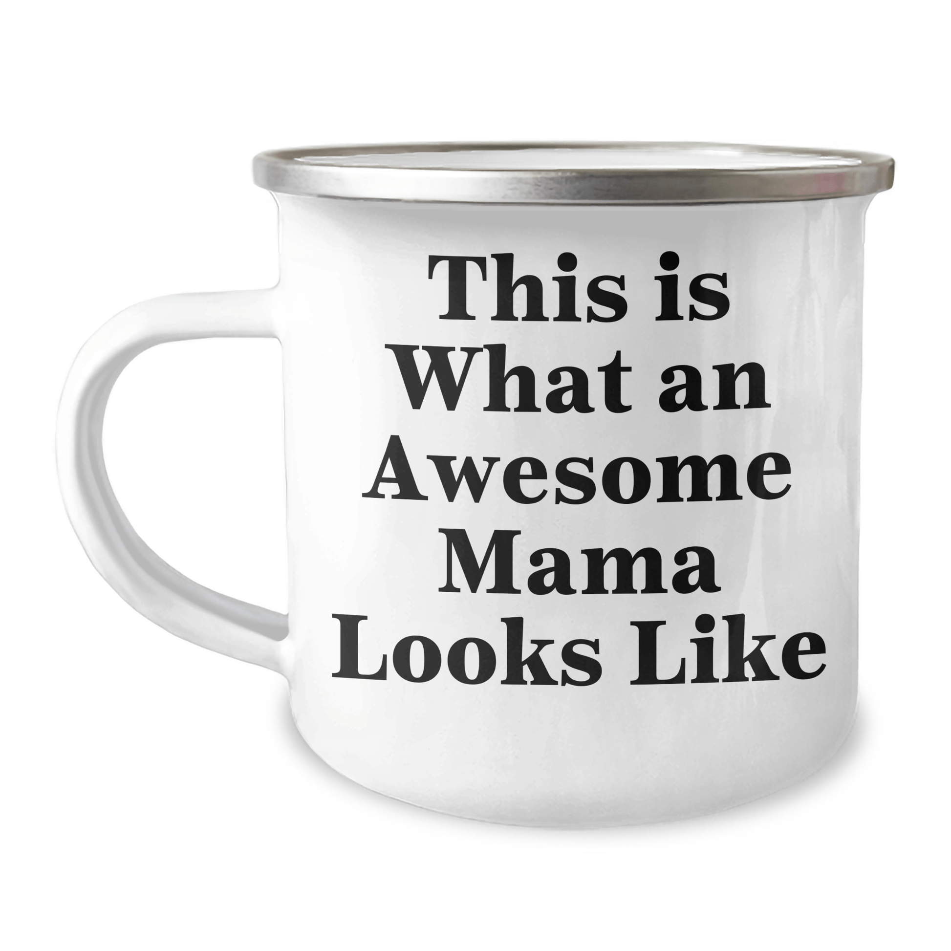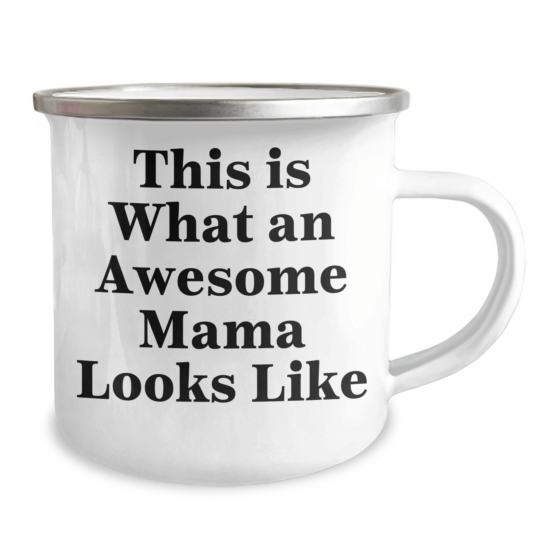 - Celebrate the awesome Mama in your life with this funny camping mug featuring the quote 'This Is What An Awesome Mama Looks Like'. Perfect for camping trips, backyard gatherings, or just a quiet morning coffee.