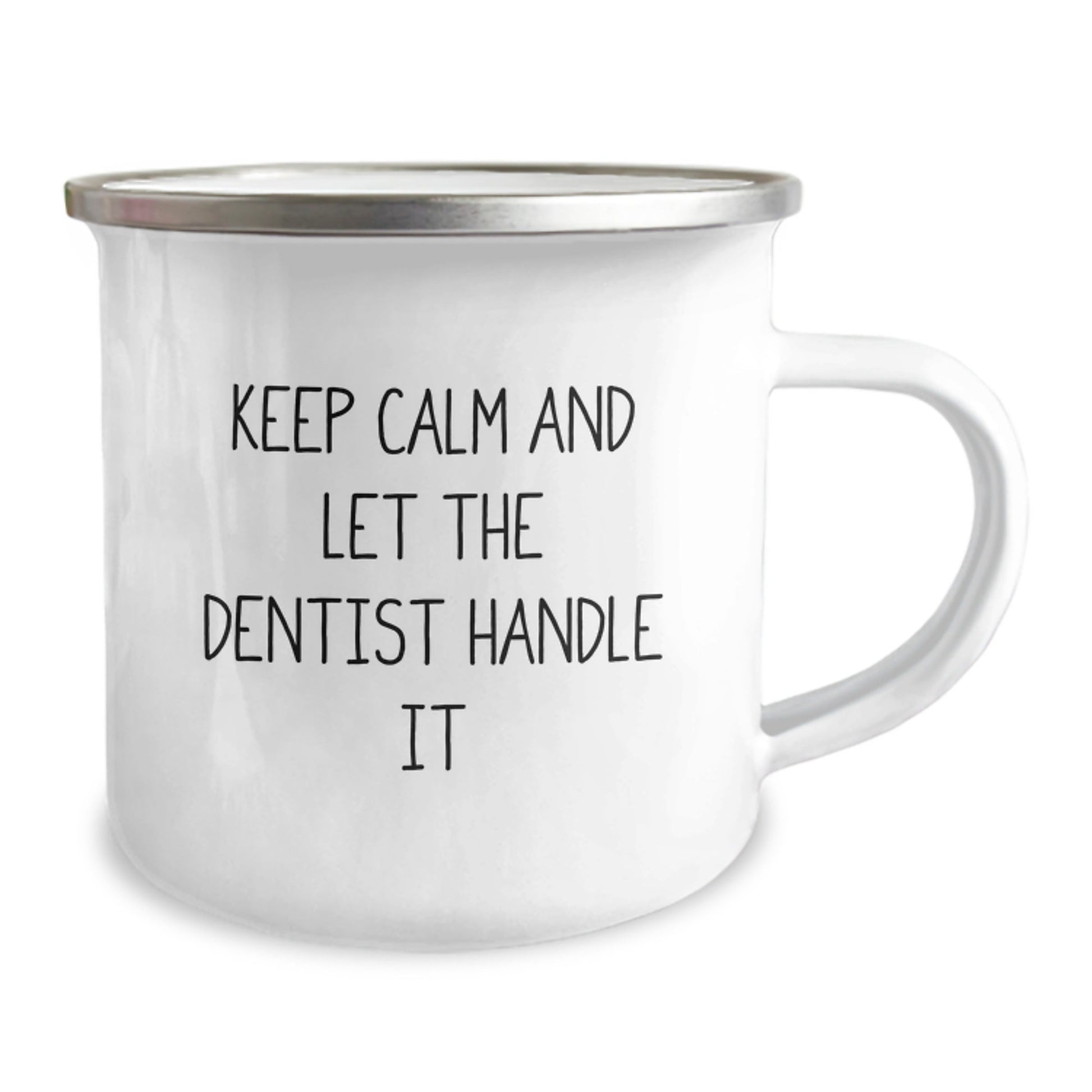 - Experience the perfect blend of camping adventure and dental care with our 'Keep Calm And Let The Dentist Handle It' Camping Mug, designed specifically for dentists and their love for the great outdoors. This 12 oz stainless steel mug with enamel finish is built to withstand the rigors of camping, with a permanent printing that won't fade after washing.