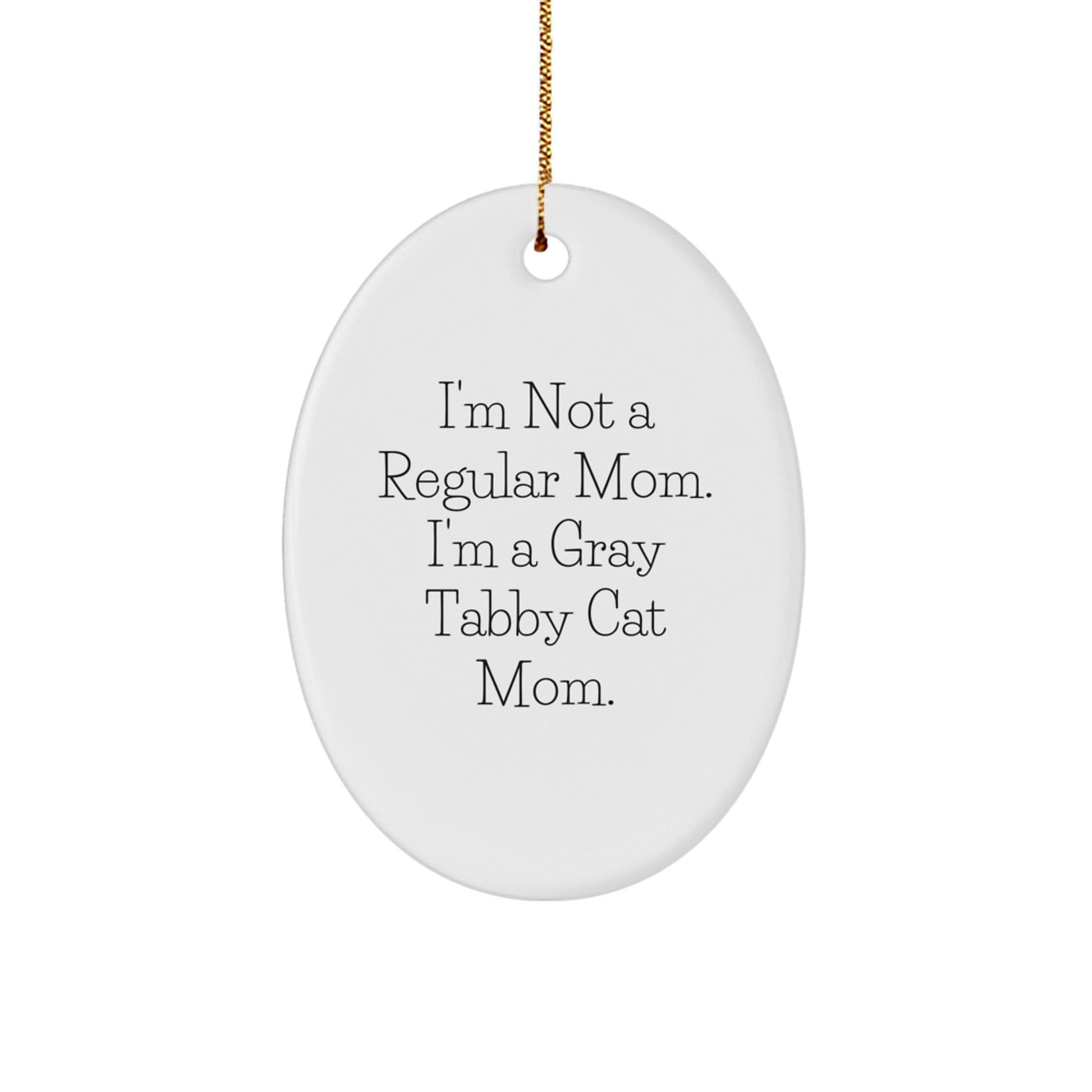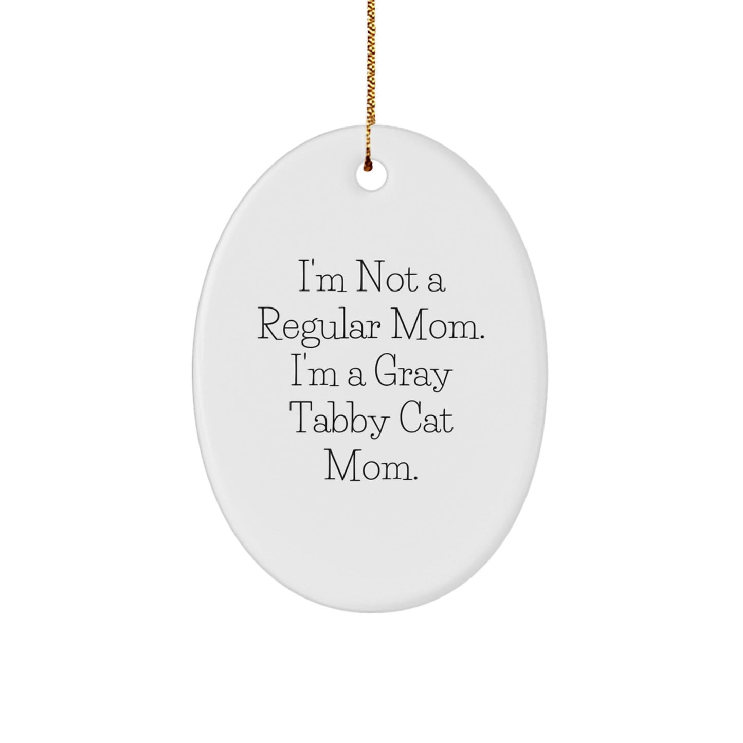 - Add a touch of humor to your Christmas decor with this funny Oval Ornament featuring the quote 'I'm Not A Regular Mom. I'm A Gray Tabby Cat Mom.'