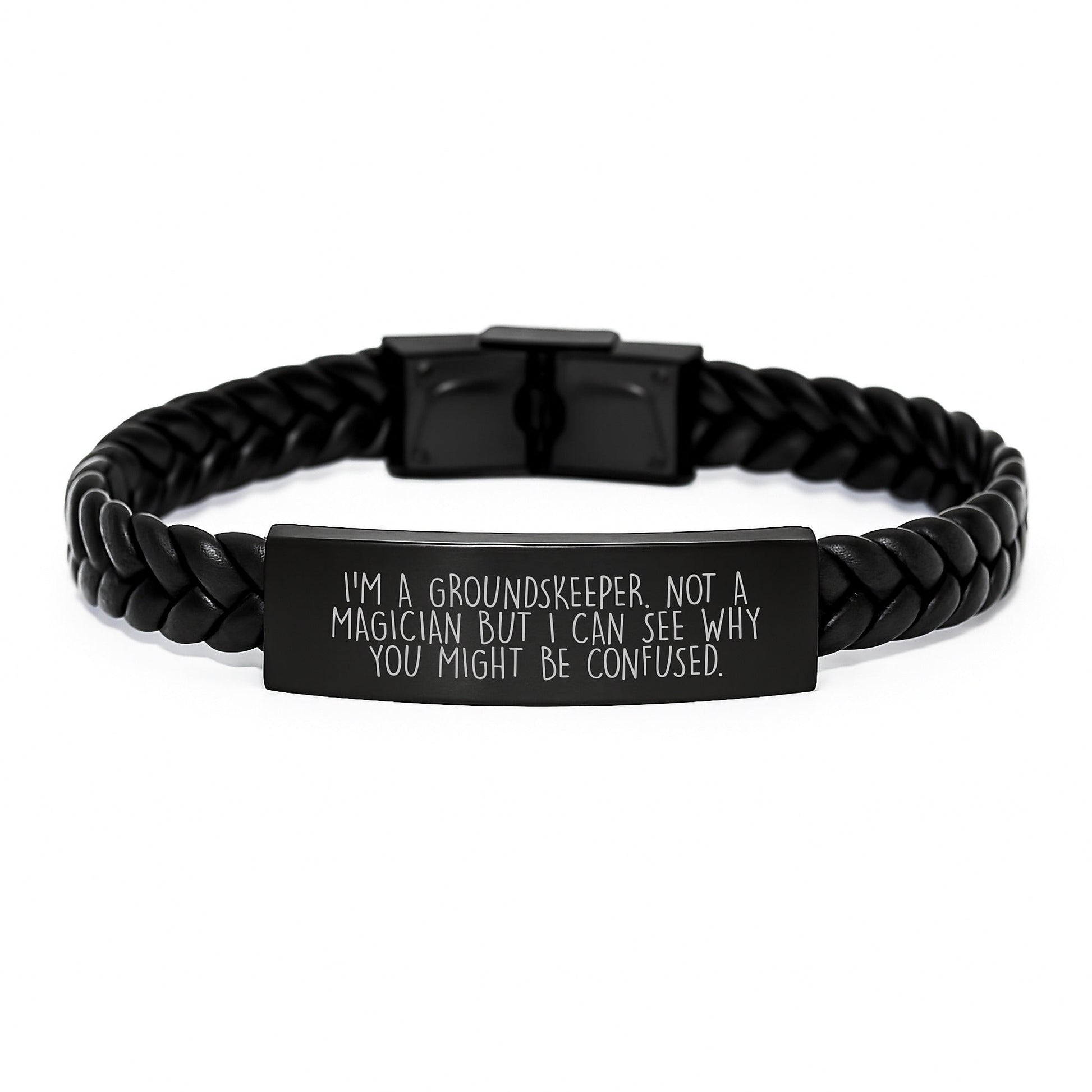 This interlaced leather bracelet is a versatile accessory that can be worn by men and women alike. The quote 'I'm A groundskeeper. Not A Magician But I Can See Why You Might Be Confused.' adds a touch of humor to this thoughtful gift.