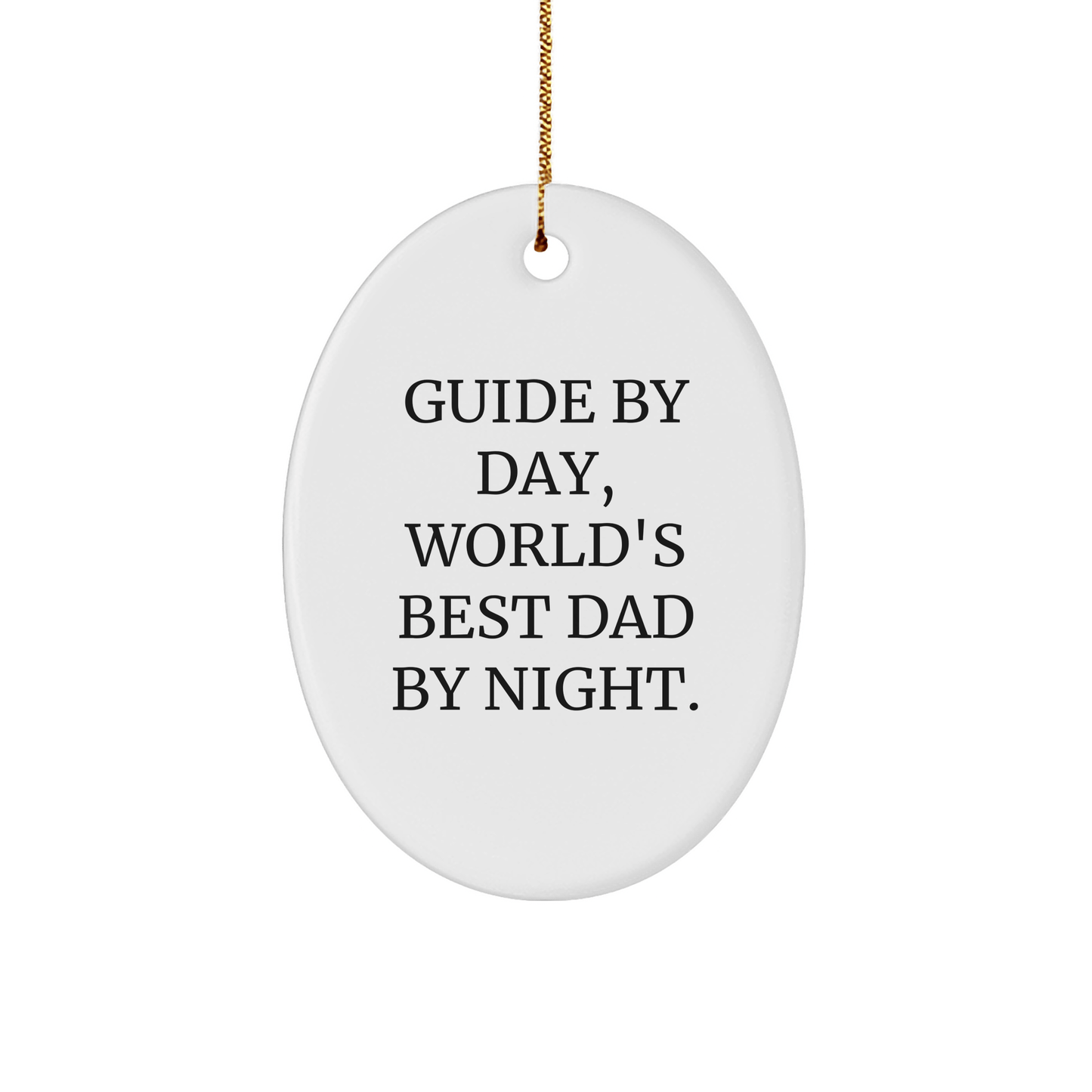 - 'Guide By Day, World's Best Dad By Night.' - A heartfelt quote that makes this oval ornament a unique and thoughtful gift for any father figure in your life. Perfect for special occasions like Christmas, this ornament is a beautiful way to celebrate their love and dedication.