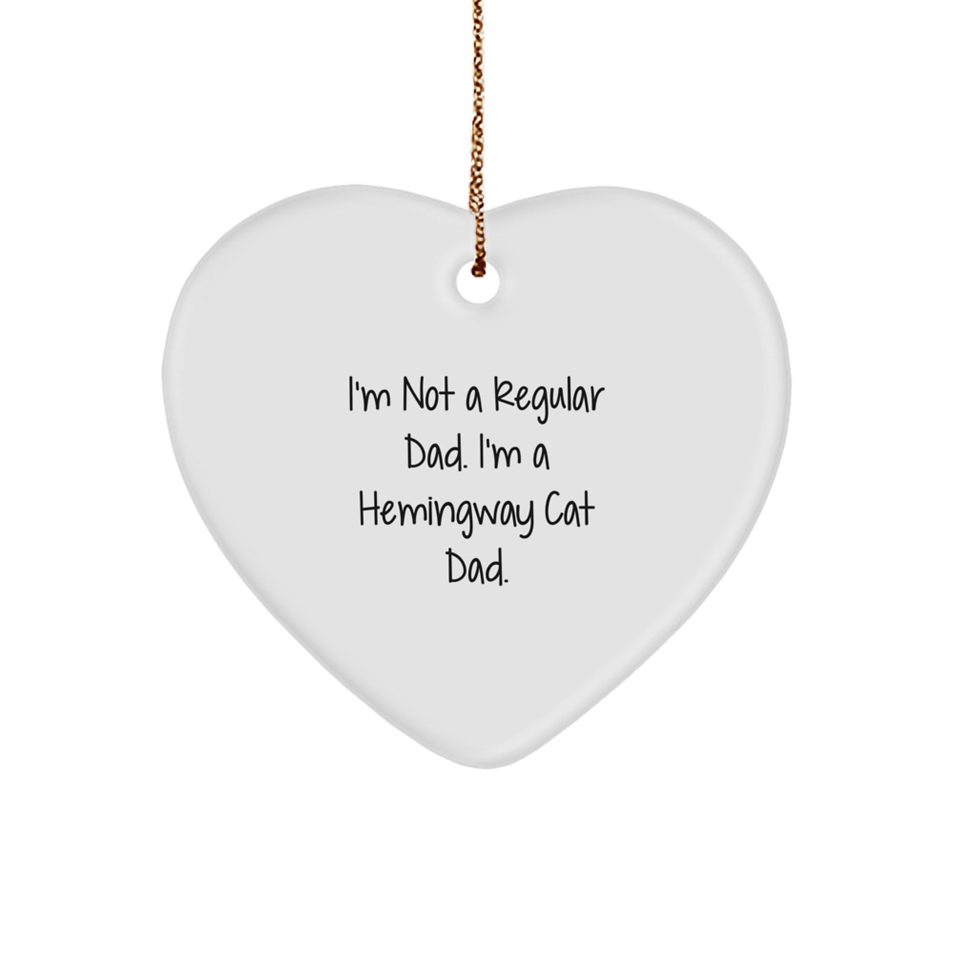 Get ready to delight Hemingway Cat enthusiasts with this adorable Heart Ornament featuring the funny quote 'I'm Not A Regular Dad. I'm A Hemingway Cat Dad.'! A unique gift for any occasion, this heart-shaped ornament is crafted from sturdy MDF with a high-gloss plastic finish, ensuring vibrant colors that will last. Perfect for hanging on the Christmas tree or as a decorative piece year-round. Whether you're a Hemingway Cat dad or just a fan of the charming cat, this gift is sure to bring a smile to their face. Share the love and humor with friends, family, or coworkers. Make it a Christmas to remember with this thoughtful and hilarious gift!
