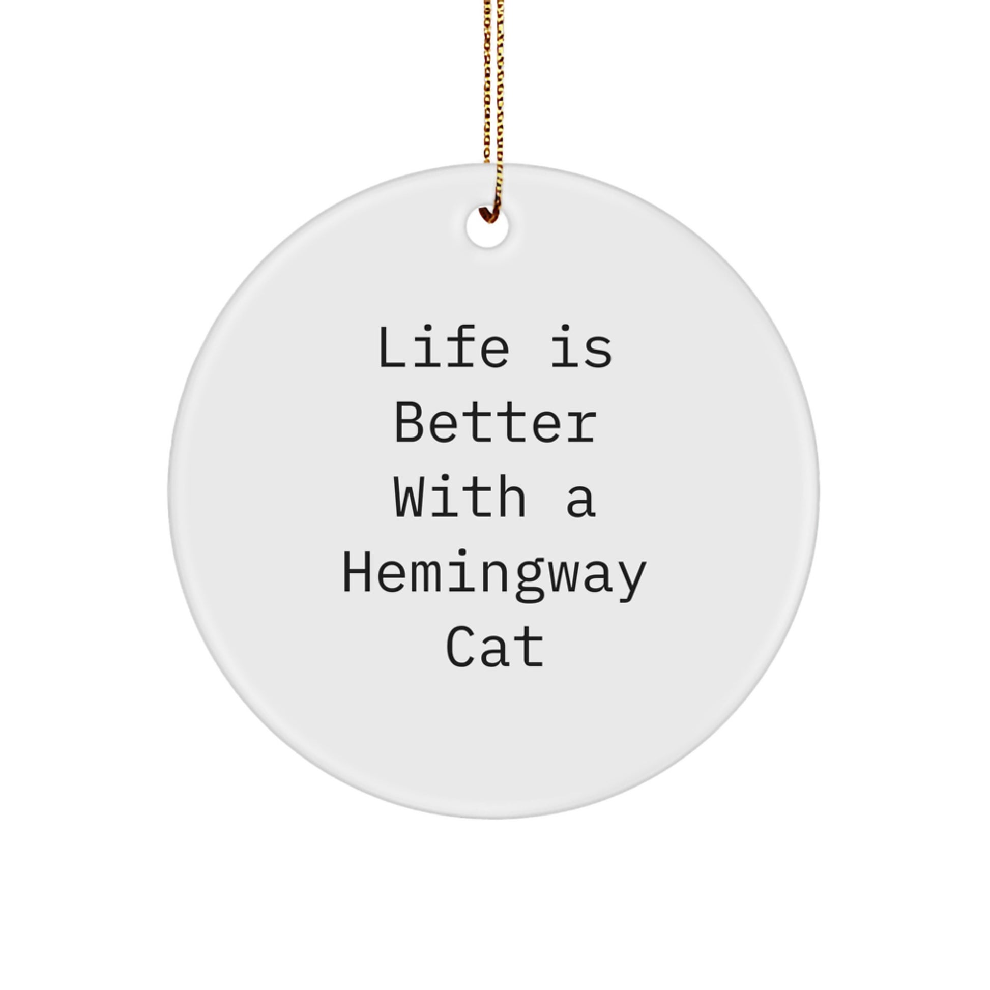- Whether you're a Hemingway Cat enthusiast or just looking for a unique and fun holiday decoration, this Circle Ornament is the perfect choice. Its lightweight and durable design make it easy to hang and display, and its festive gold cord adds a touch of elegance.