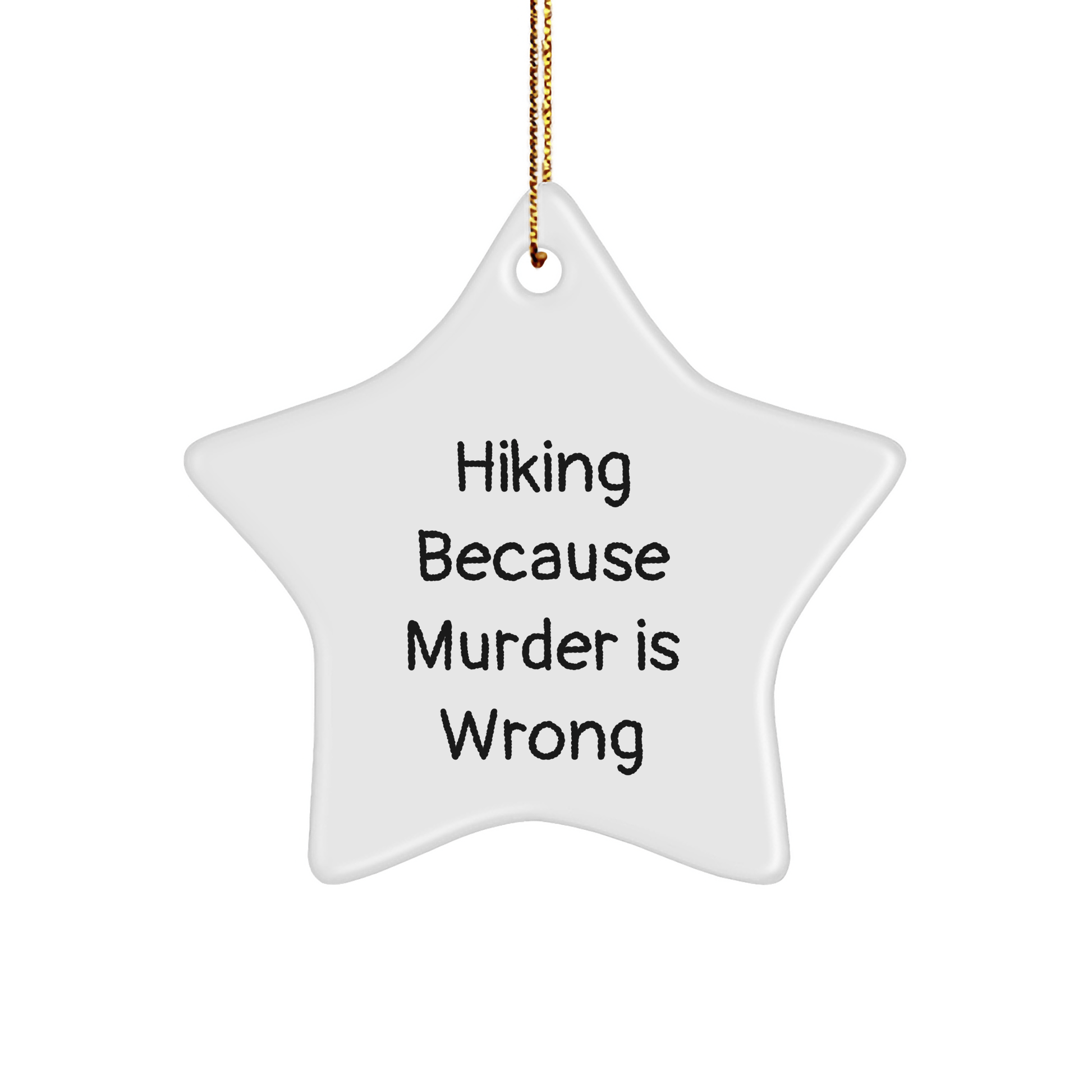- Add a touch of humor to your holiday decorations with this funny star ornament, featuring the quote 'Hiking Because Murder Is Wrong' - a great gift for hiking enthusiasts and anyone who loves a good laugh.