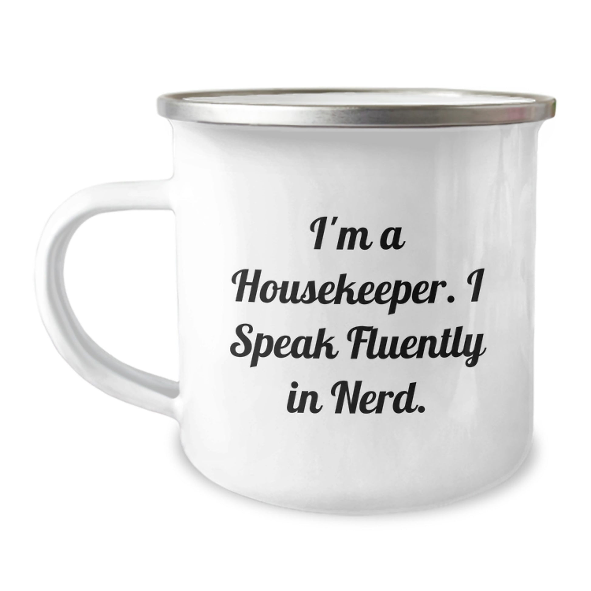 Are you looking for a unique gift for the housekeeper in your life? Look no further! This funny camping mug is the perfect way to show your appreciation for their hard work. As a housekeeper, they deserve a break and some humor in their daily routine. This quote 'I'm A Housekeeper. I Speak Fluently In genius.' is a great way to add some personality to their morning coffee.