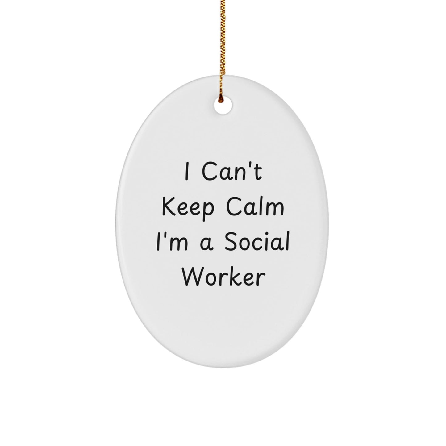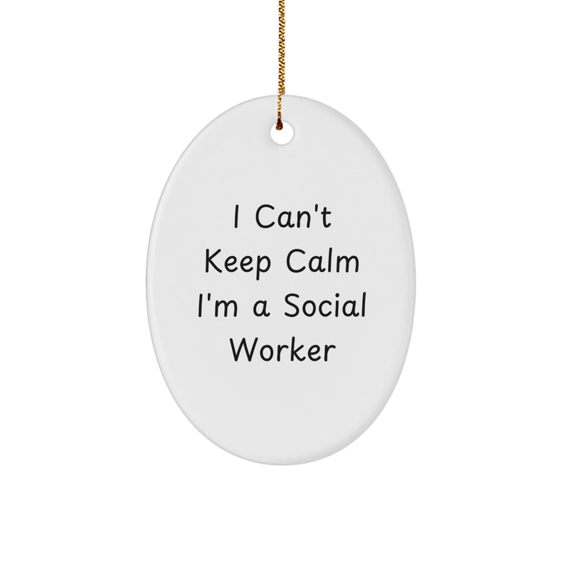 - This oval ornament is a fun and unique way to show off your social work pride. The quote 'I Can't Keep Calm, I'm a Social Worker' is a great way to express your dedication to the profession.