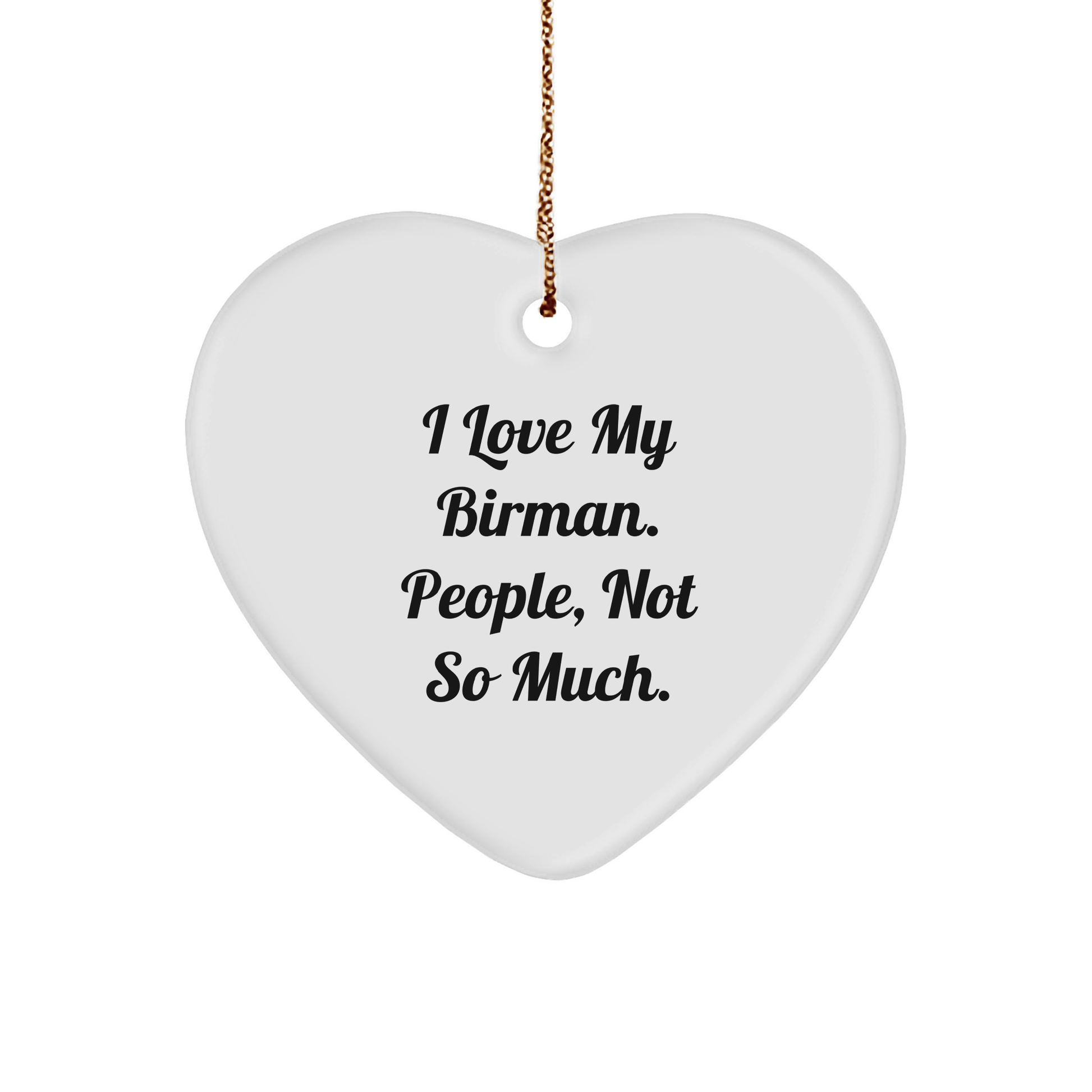 If you're a Birman Cat enthusiast, you'll love this funny heart ornament that pokes fun at life with the quote 'I Love My Birman. People, Not So Much.' It's the ideal gift for friends and family who adore their feline friends, just like you. The vibrant design is printed from edge-to-edge on a sturdy MDF heart shape, making it a unique and thoughtful present for any occasion. Whether you're a cat lover yourself or know someone who is, this heartwarming ornament is sure to bring a smile to their face. Make it a special Christmas gift for your loved ones and create a joyful holiday season.