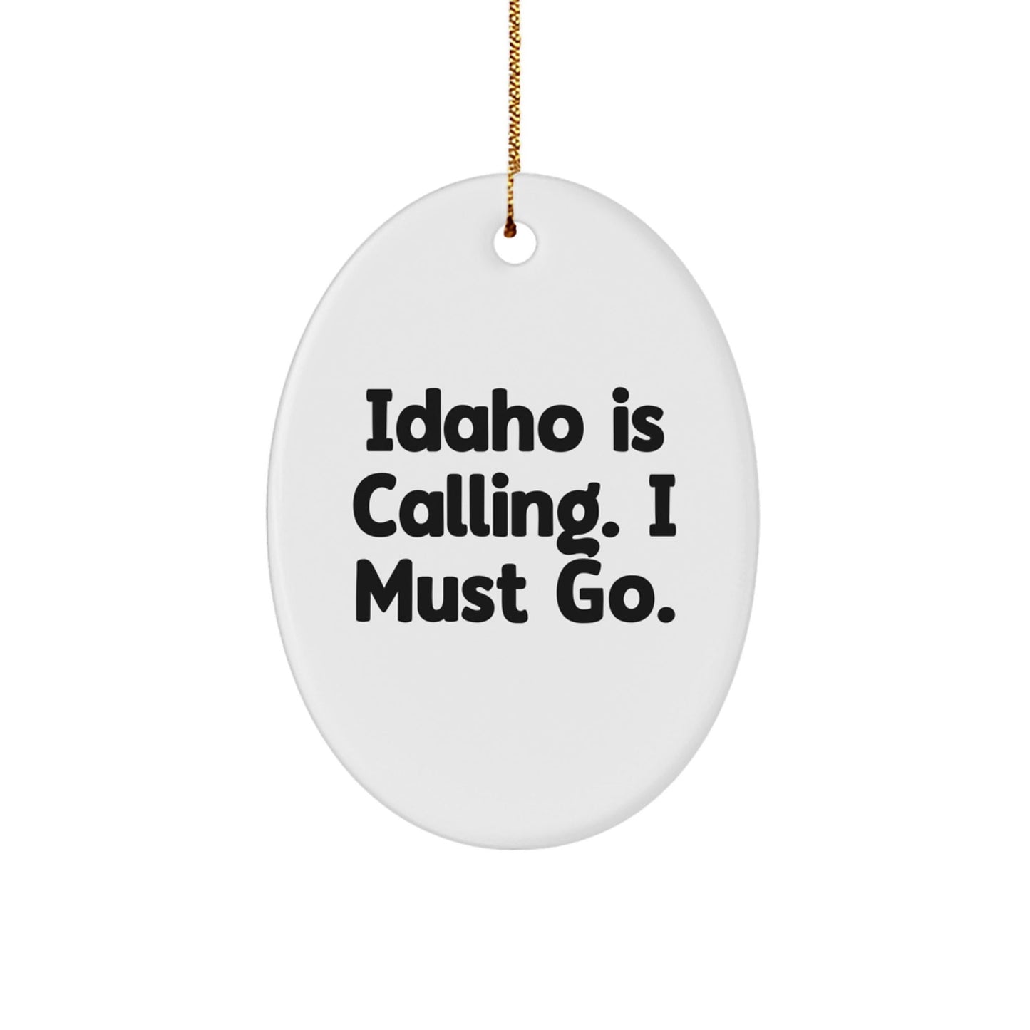 Calling all Idaho enthusiasts and those who love the Gem State! This oval ornament is the ideal gift for friends and family who have a special connection to Idaho. The vibrant quote 'Idaho Is Calling. I Must Go.' adds a touch of humor and whimsy to any Christmas tree or window display. This ornament is crafted from sturdy MDF with a high-gloss plastic finish, ensuring it will withstand the test of time. The lightweight design makes it easy to hang and enjoy. Whether you're sending this gift to friends who live in Idaho or those who just love the state, this unique Christmas present is sure to bring a smile to their faces. This ornament is perfect for anyone who loves Idaho, whether it's a local or someone who just loves the state's natural beauty. So why wait? Get your Idaho-themed gift today and share the love with friends and family!