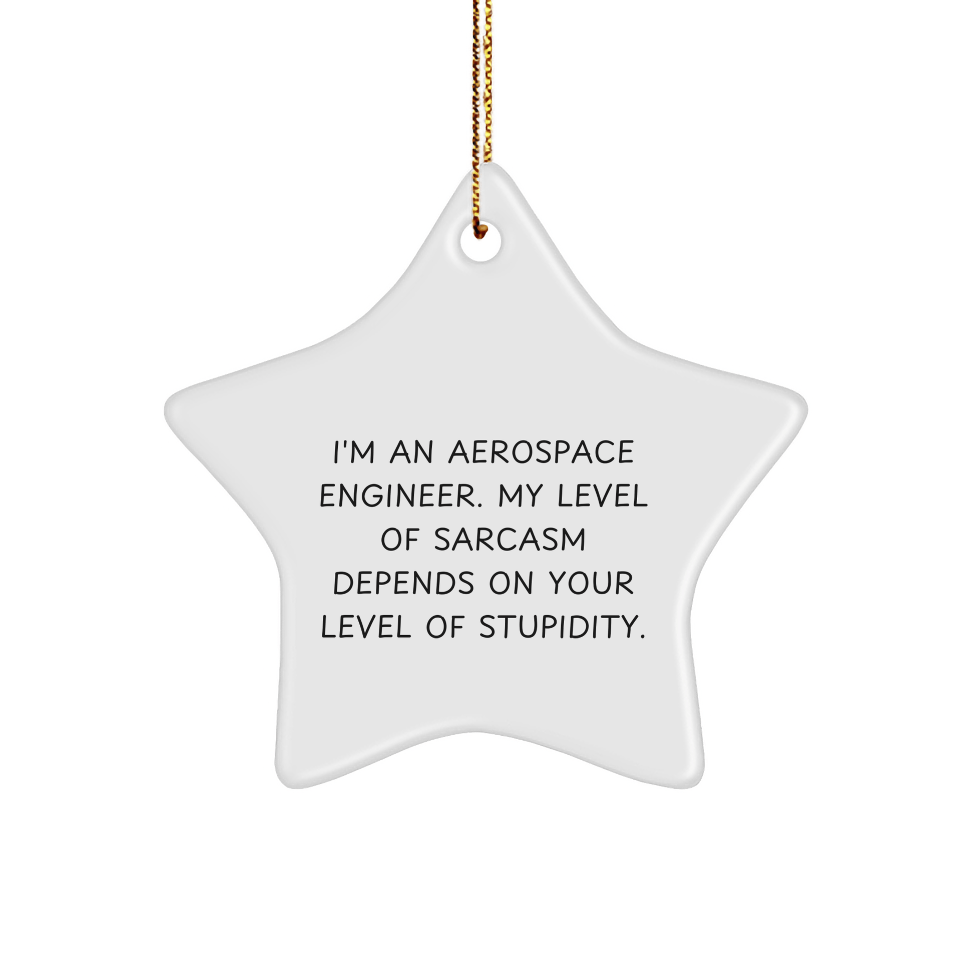 The quote 'I'm An Aerospace Engineer My Level Of Sarcasm Depends On Your Level Of Stupidity' adds a touch of humor and personality to this gift, making it a thoughtful and entertaining present for any Aerospace Engineer. Whether you're shopping for a colleague, friend, or family member, this Star Ornament is sure to bring a smile to their face.