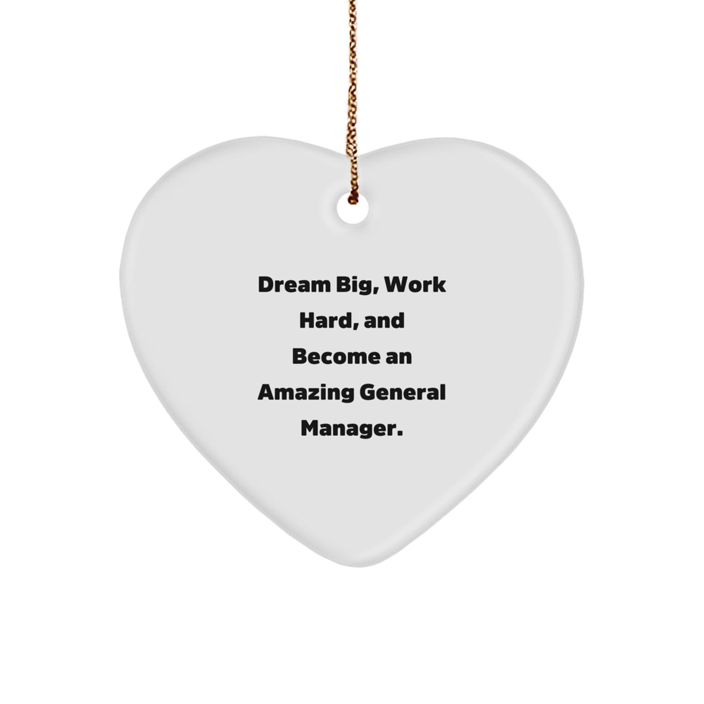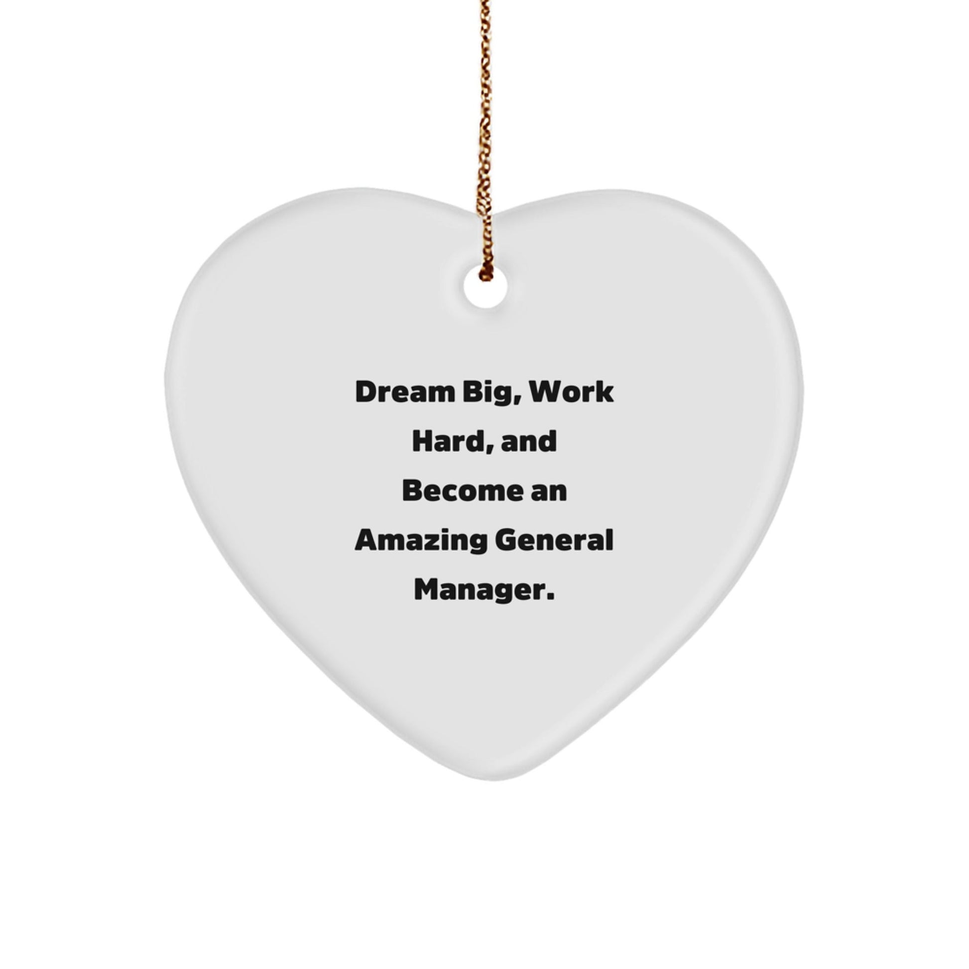 This Heart Ornament is crafted from sturdy MDF with a high-gloss plastic finish, making it a great choice for households with children or pets. It's lightweight, easy to hang, and resistant to breaking. The quote 'Dream Big, Work Hard, And Become An Amazing General Manager.' is printed from edge-to-edge via Sublimation, ensuring a long-lasting design.