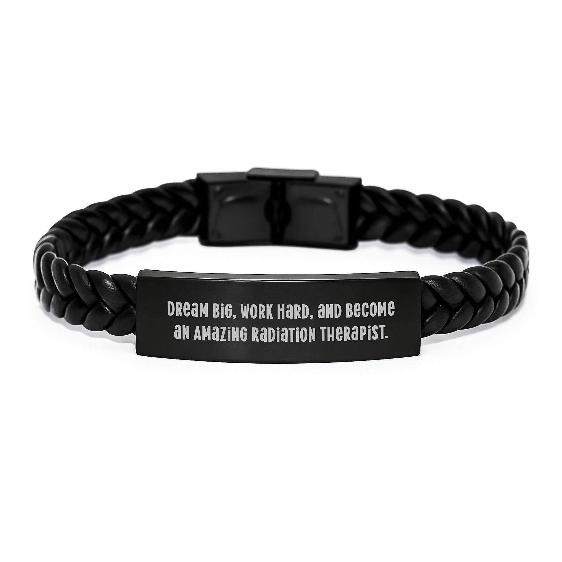 - Make a statement with this stunning interlaced leather bracelet, perfect for Radiation Therapists who 'Dream Big, Work Hard, And Become An Amazing Radiation Therapist.' The unique design combines stainless steel and PU leather for a versatile and durable accessory that's sure to turn heads.