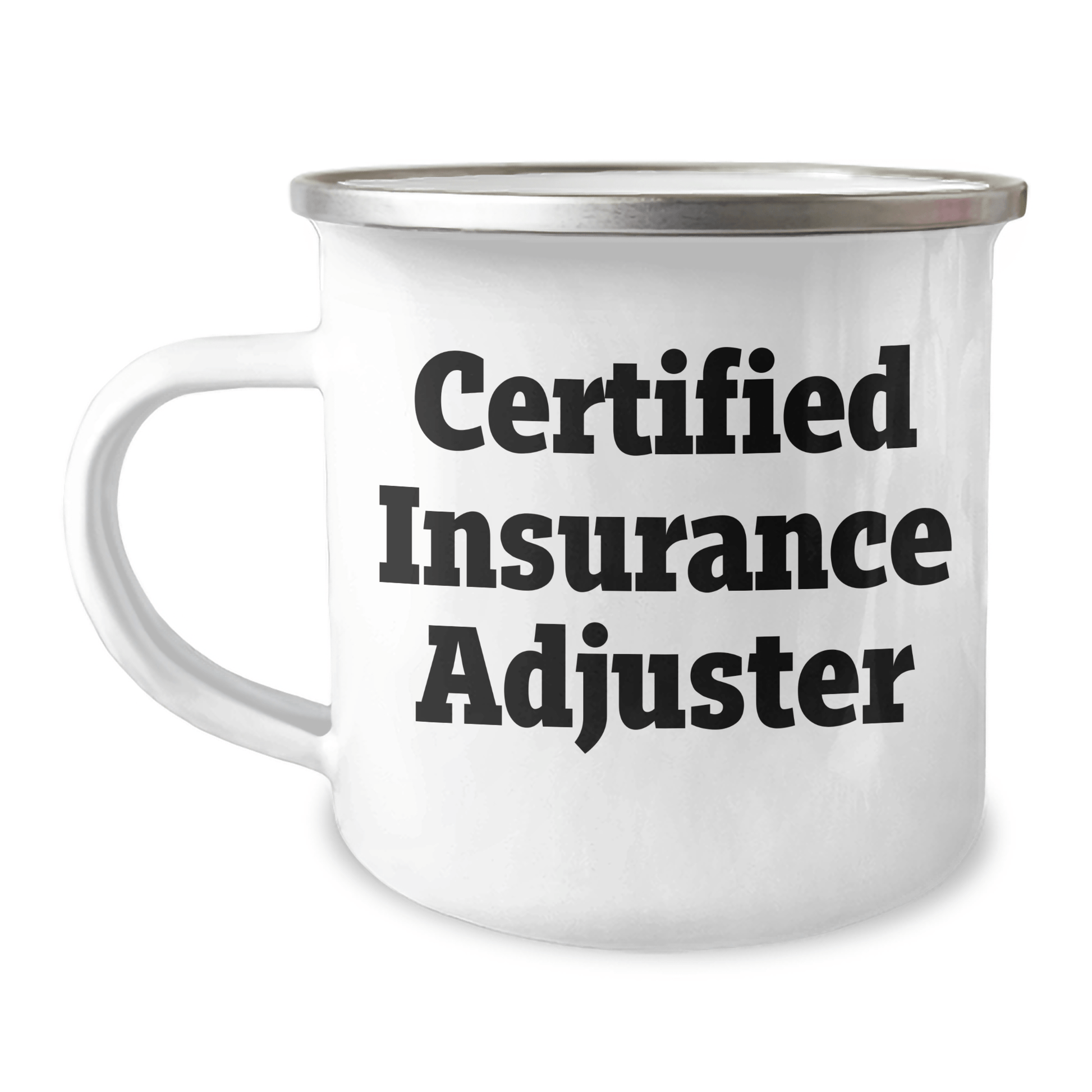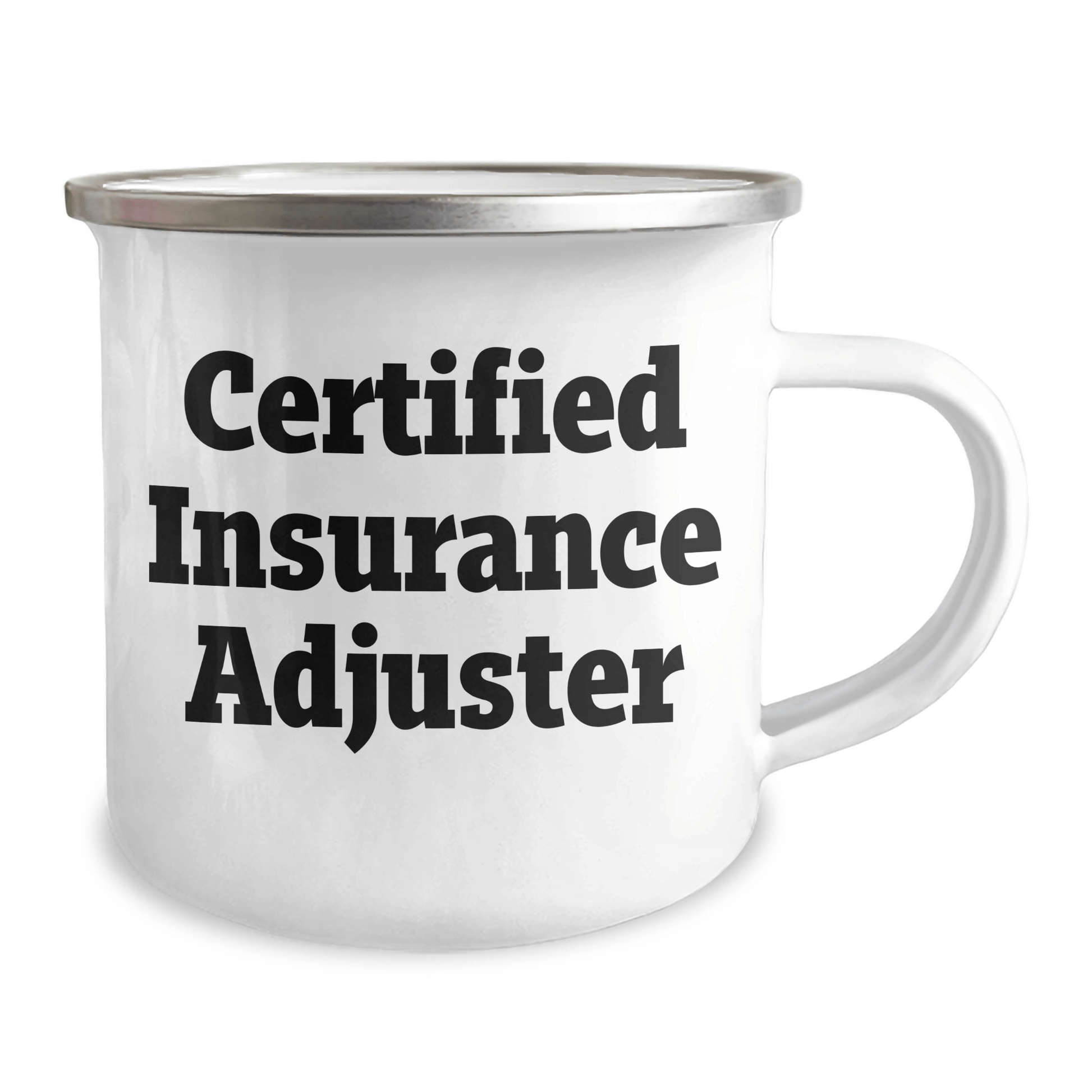 - This funny quote 'Certified Insurance Adjuster' camping mug is a unique gift idea for any insurance adjuster on Father's Day or any other occasion. The mug is made of sturdy stainless steel with an enamel finish, making it easy to clean and resistant to fading.