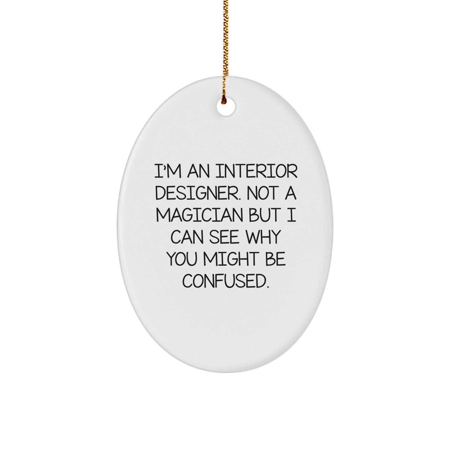 As an Interior Designer enthusiast, you know the importance of unique and thoughtful gifts for your fellow designers. This Oval Ornament is a delightful addition to any room, featuring the charming quote 'I'm An Interior Designer. Not A Magician But I Can See Why You Might Be Confused.'