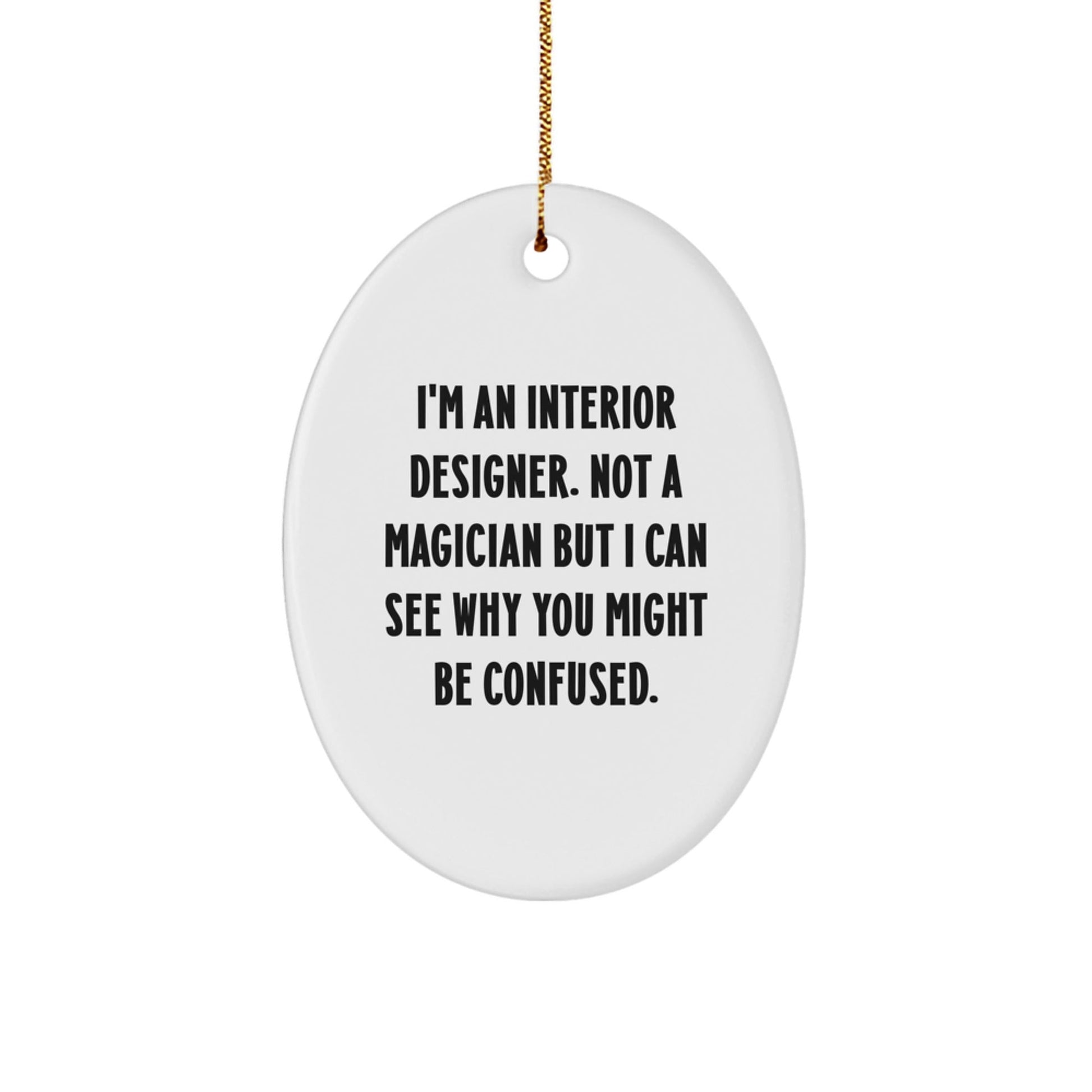 - The quote on the ornament says 'I'm An Interior Designer. Not A Magician But I Can See Why You Might Be Confused.' - a hilarious way to poke fun at the idea that Interior Designers are somehow magical