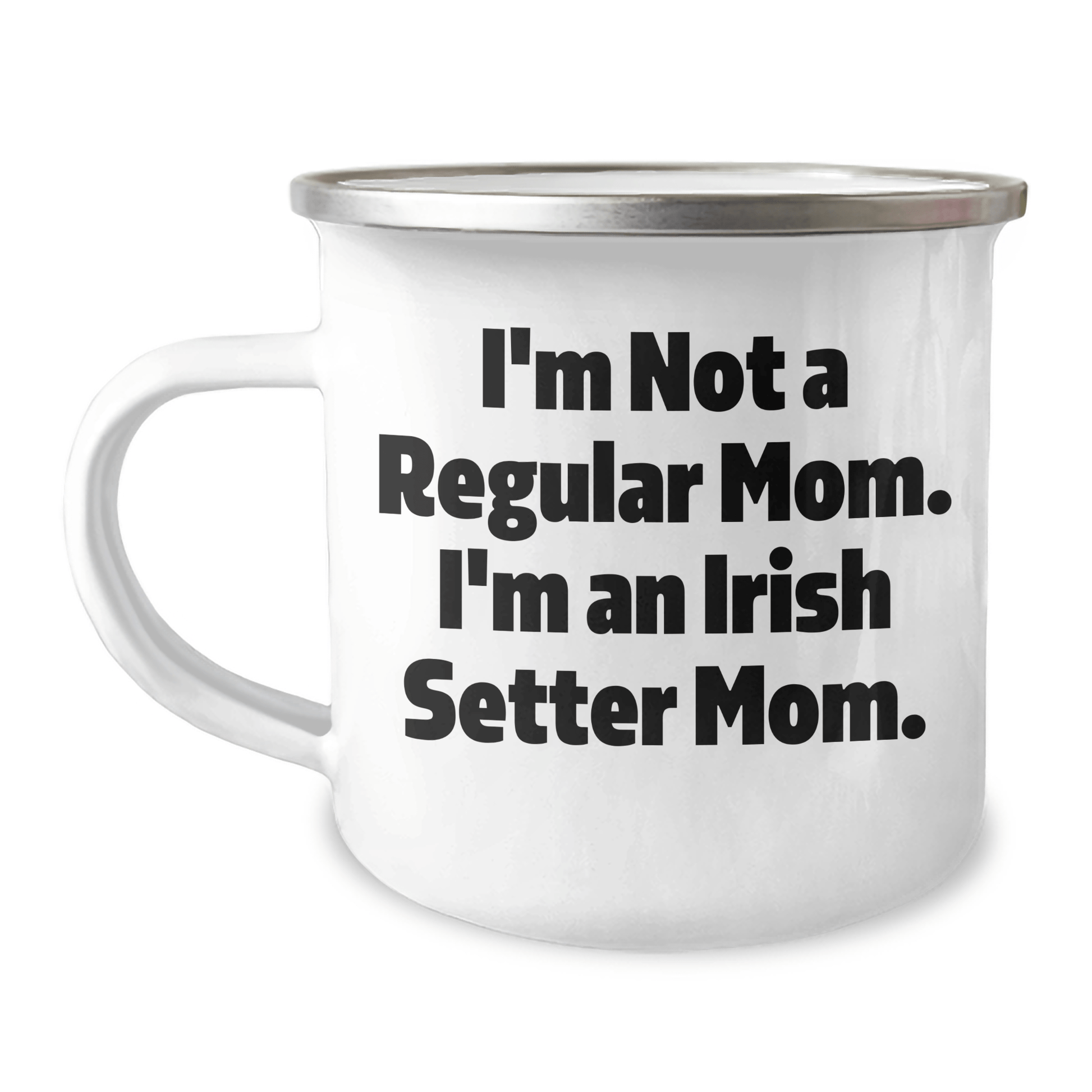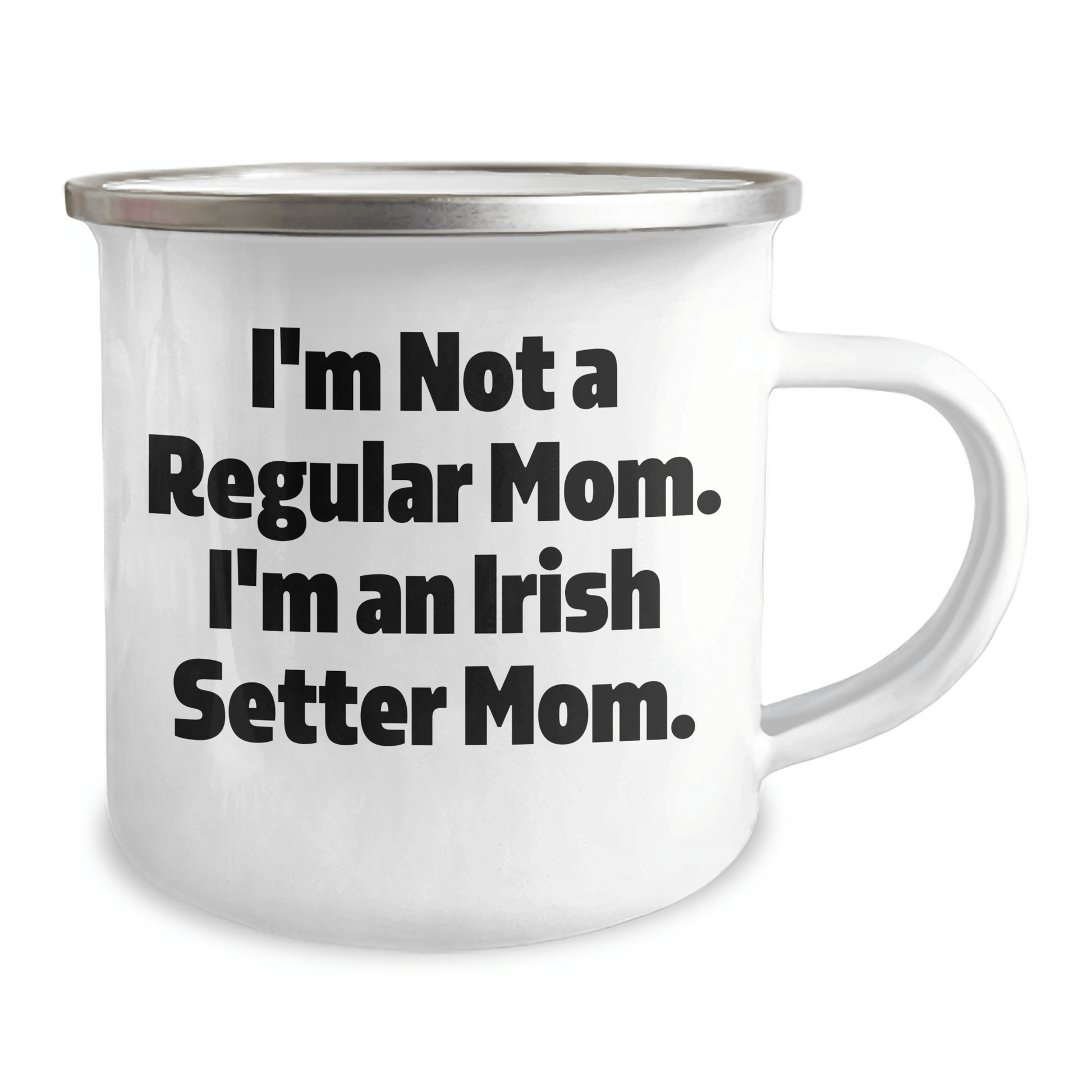 If you're an Irish Setter dog enthusiast or looking for a unique gift for an Irish Setter dog mom, this funny camping mug is the perfect choice. With its permanent printing and stainless steel with enamel finish, this mug is both sturdy and easy to clean. Hand washing with mild detergent is recommended. The quote 'I'm Not A Regular Mom. I'm An Irish Setter Mom.' is a hilarious and relatable message for any Irish Setter dog mom. Whether you're a family member or a friend, this gift is sure to bring a smile to her face. Graduation is a special occasion, and this mug is a thoughtful gift to celebrate this milestone. Make it a memorable one with this funny and unique Irish Setter dog mom gift.