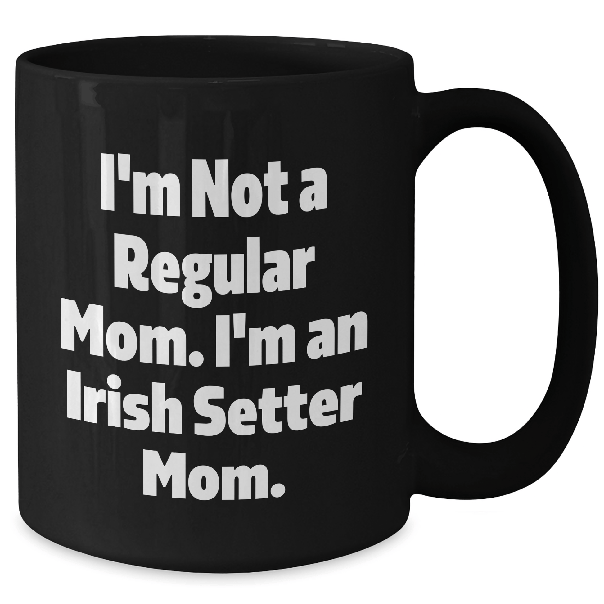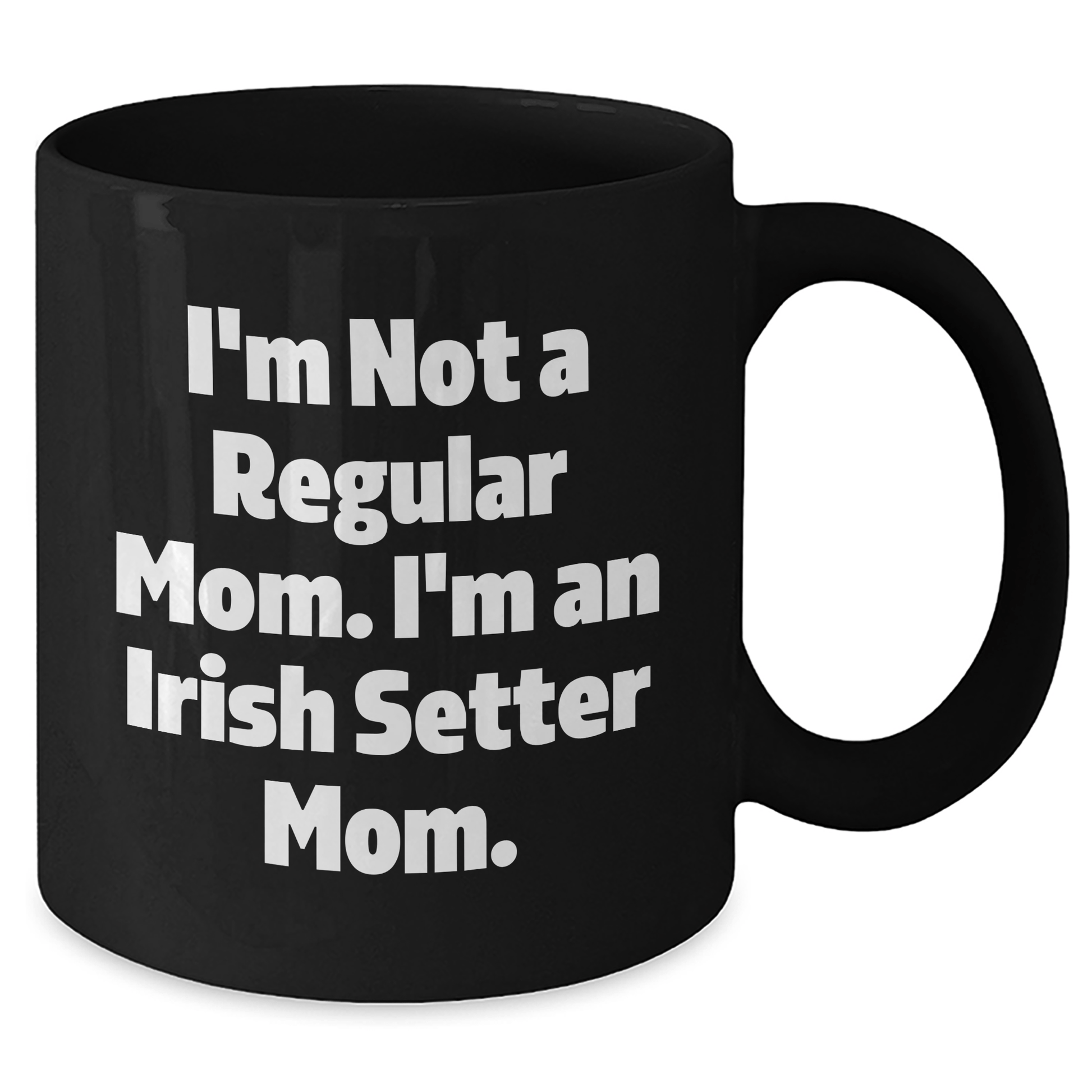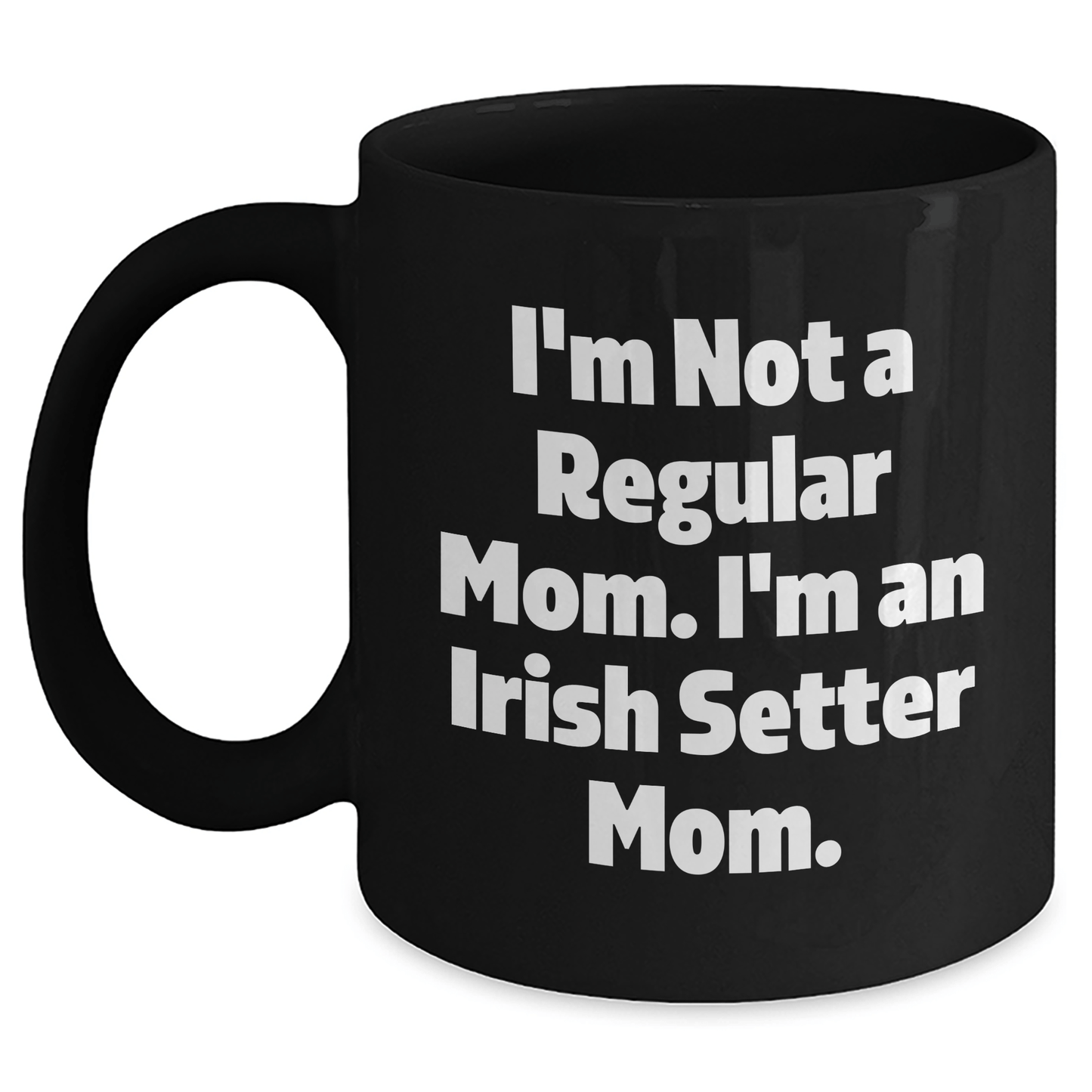 Are you an Irish Setter Dog enthusiast looking for a unique gift for the dog mom in your life? Look no further! Our black coffee mug is the perfect addition to their daily routine, featuring a funny quote that will make them laugh and smile. The quote 'I'm Not A Regular Mom. I'm An Irish Setter Mom.' is a great way to show your appreciation for their dedication and love for their furry friend.