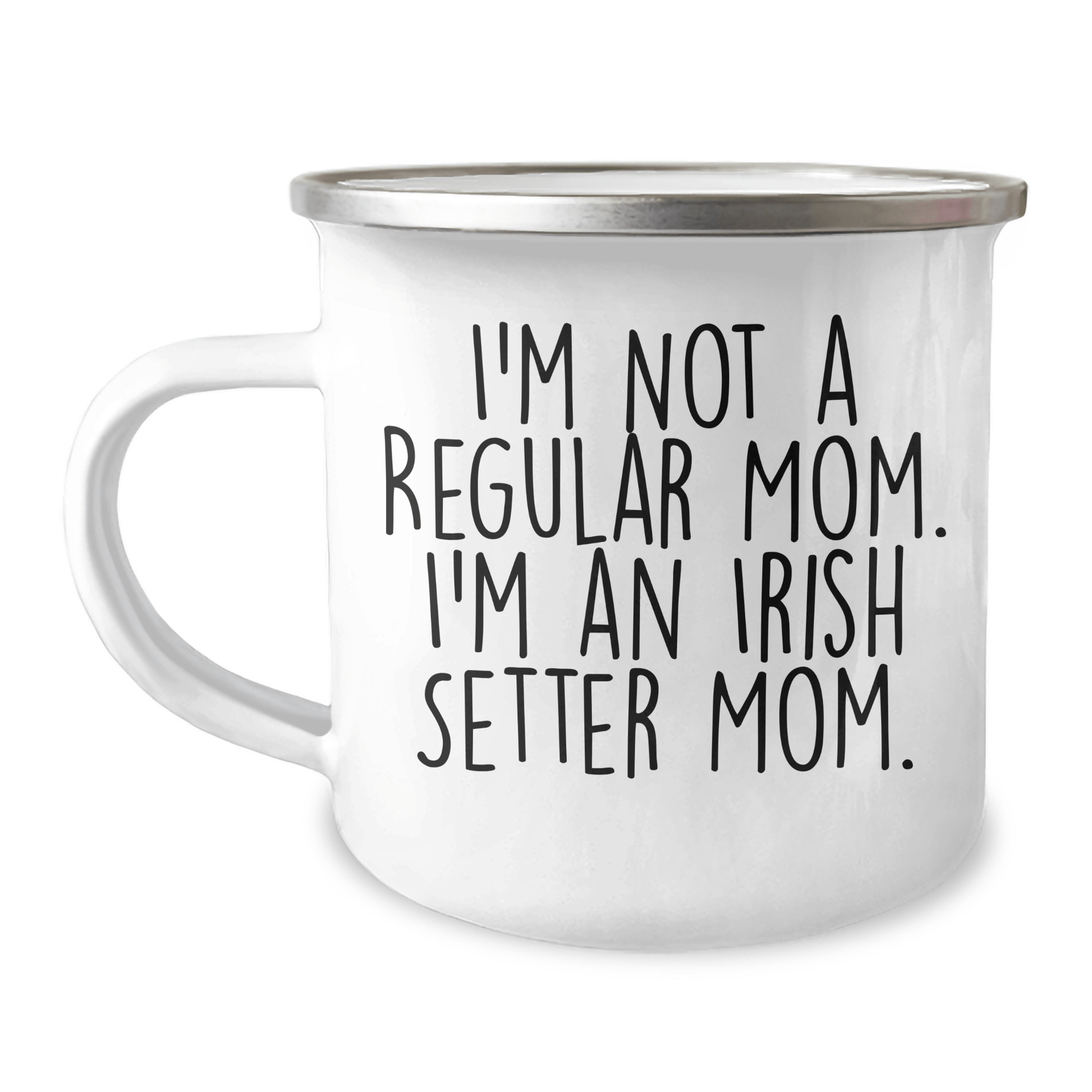 - Stunning gift for Irish Setter dog lovers! This camping mug features a unique quote 'I'm Not A Regular Mom. I'm An Irish Setter Mom.' that makes it an ideal graduation present or birthday gift for any dog enthusiast. Made of stainless steel with an enamel finish, this mug is sturdy and easy to clean.