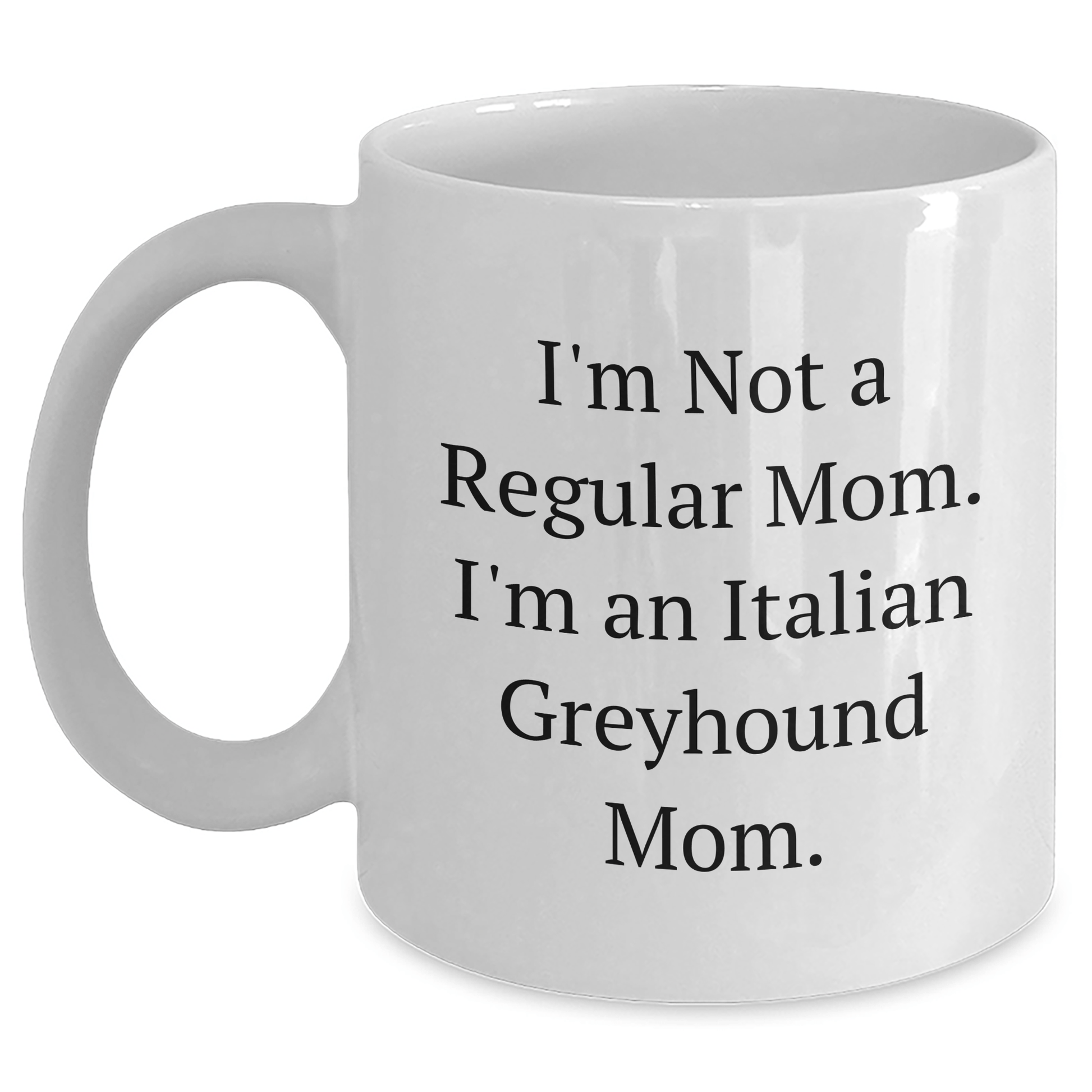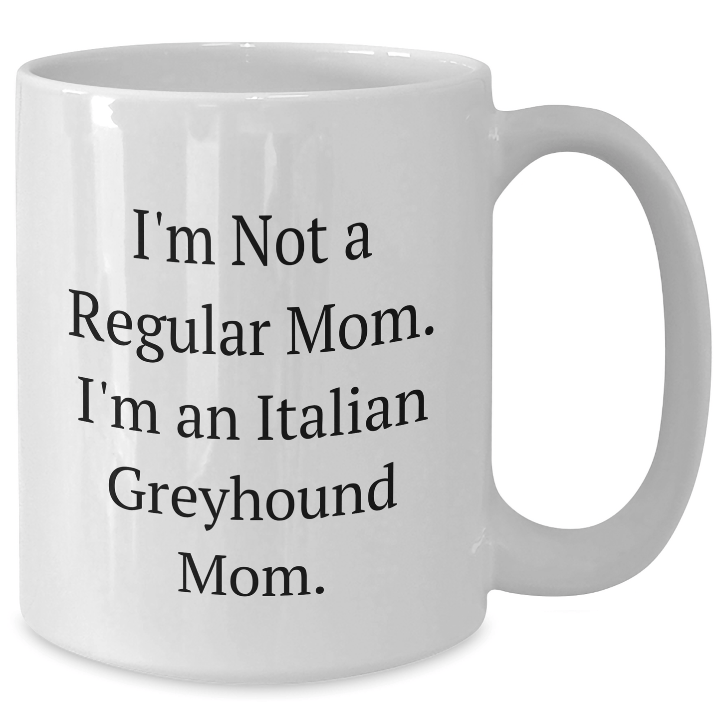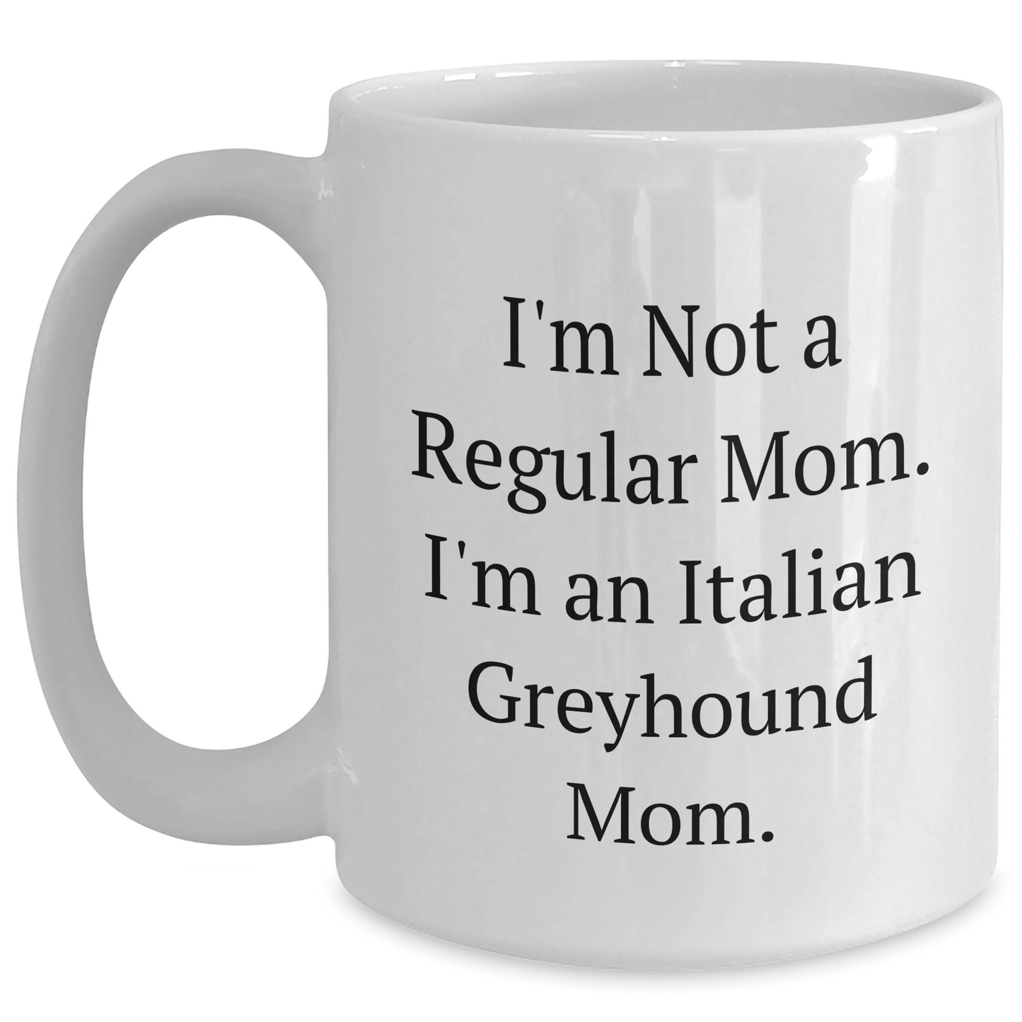 This funny quote 'I'm Not A Regular Mom. I'm An Italian Greyhound Mom.' is sure to bring a smile to the face of the Italian Greyhound Dog mom in your life. Whether it's for a graduation, a birthday, or just because, this White Coffee Mug is sure to be a hit.
